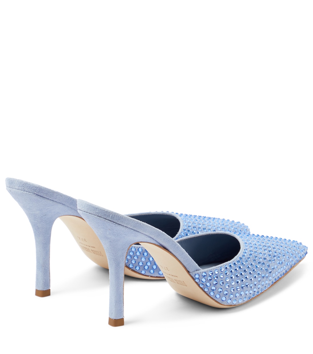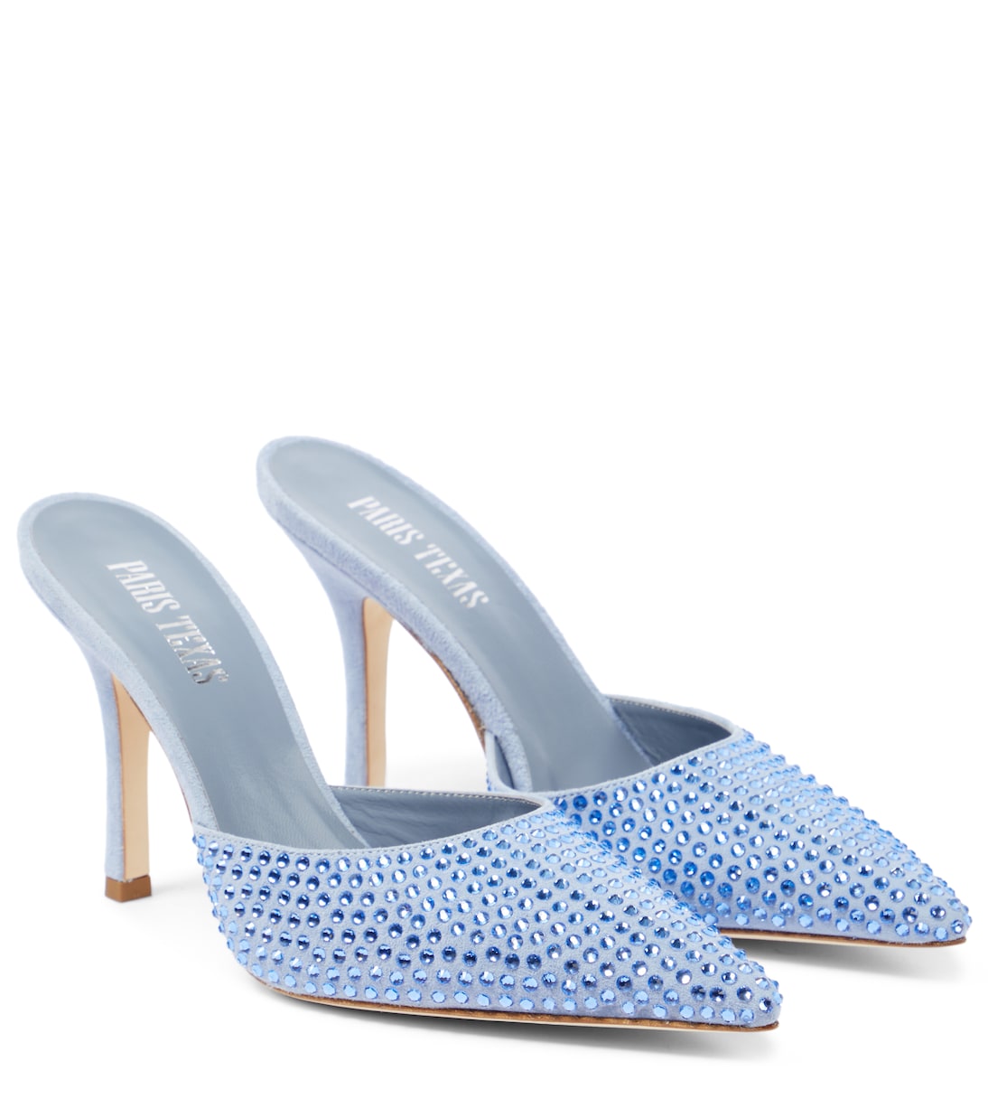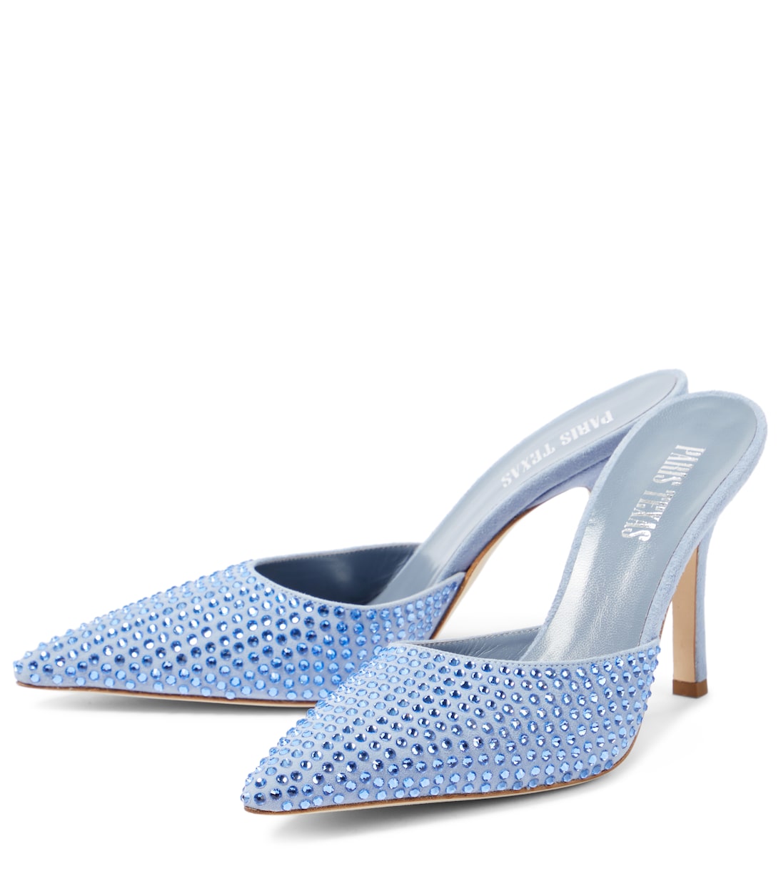 Эти мюли от Paris Texas, воплощающие текстурный контраст, инкрустированы мерцающими тональными кристаллами вдоль замшевой союзки. Они имеют элегантно заостренный носок и каблук-шпильку.