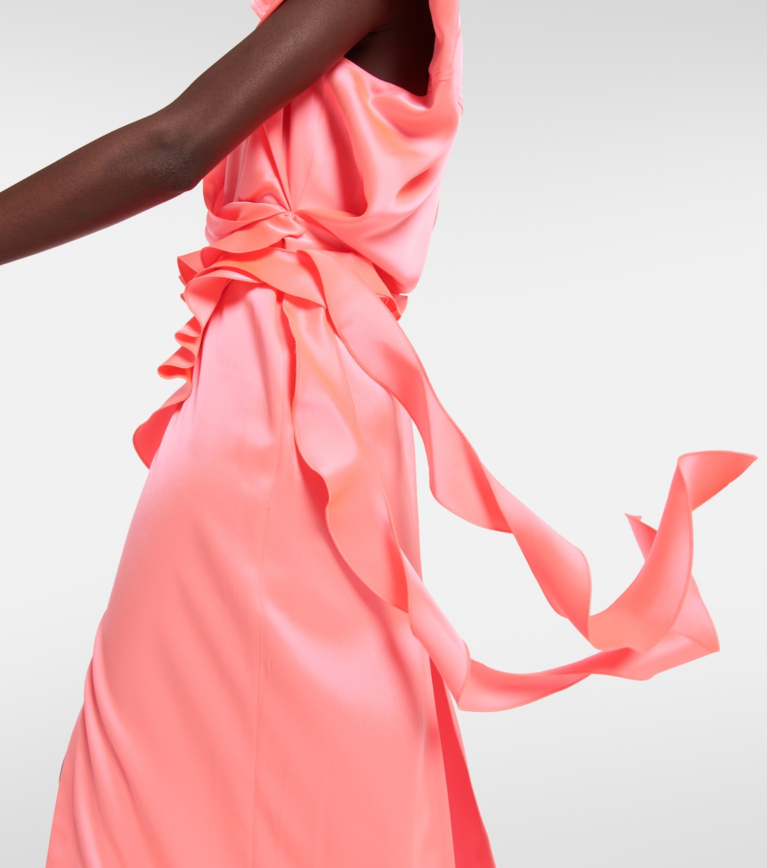 Это атласное платье-халат от David Korma деконструирует тело с помощью свободных силуэтов и ниспадающих оборок. Модель дополнена подбитыми плечами и имитацией карманов, что добавляет визуального и структурного интереса.