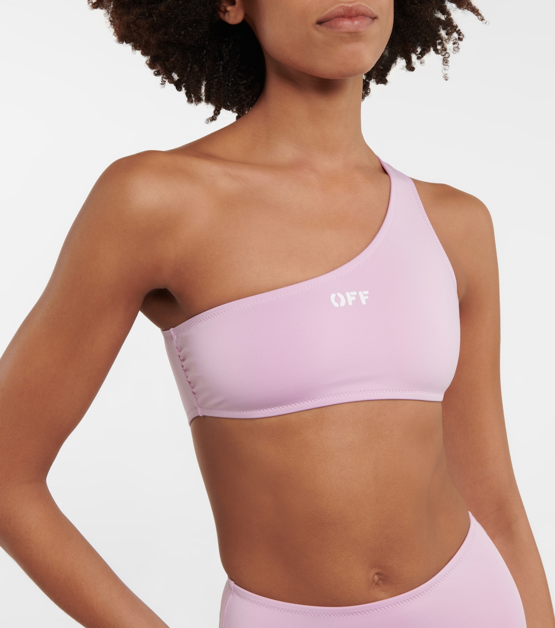 Это бикини от Off-White состоит из верха на одно плечо и трусиков с высокой талией. Комплект с принтом логотипа и средней степенью защиты.
