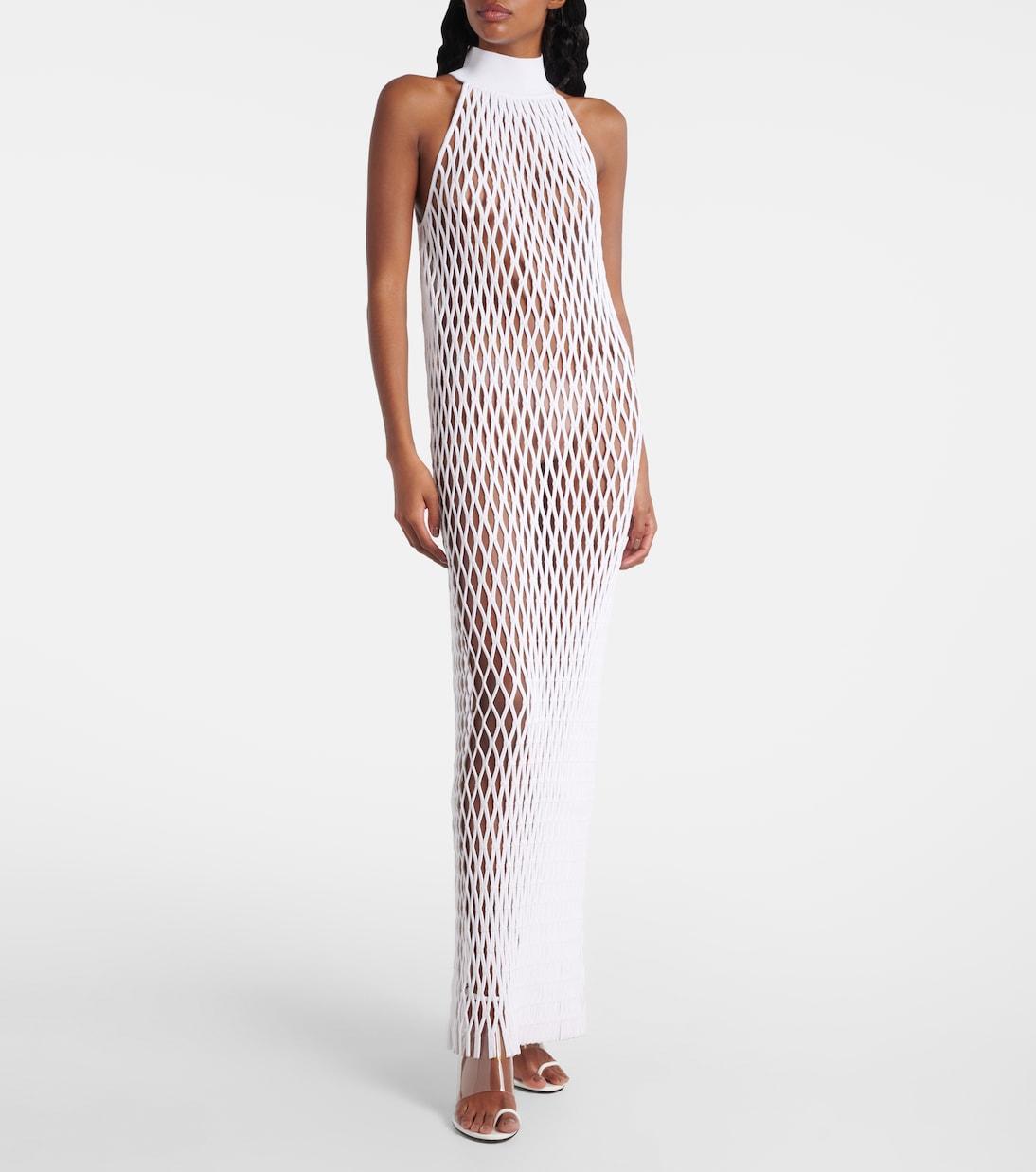 Это длинное платье из макраме от Alaïa привлекает внимание ажурным дизайном и ребристым высоким воротом. Обладая необработанными краями и приталенным силуэтом, он сочетает в себе изысканное мастерство с современной элегантностью.