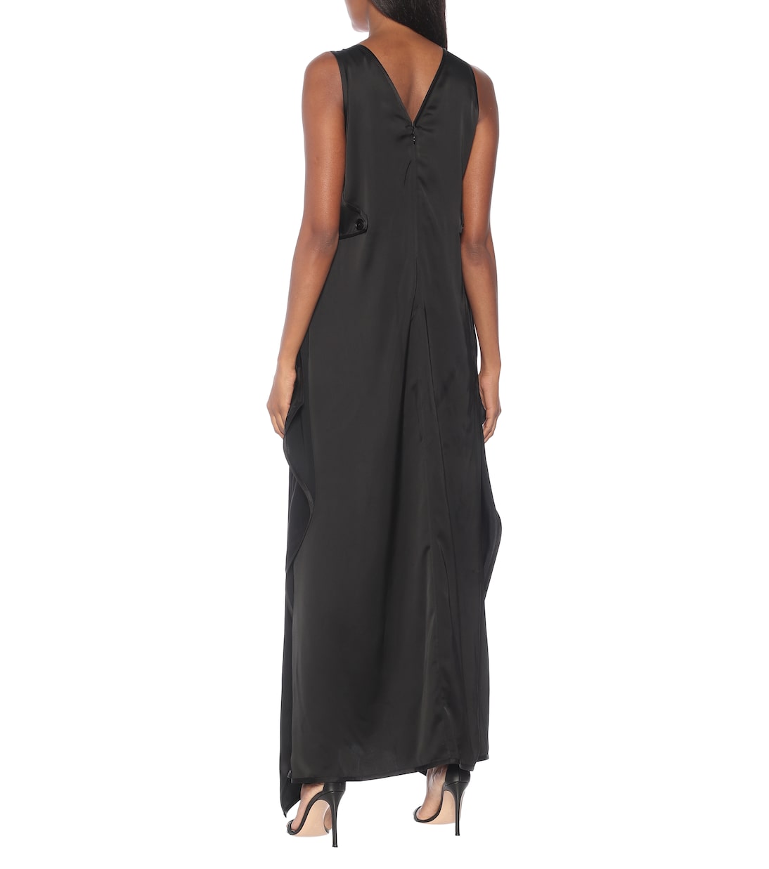 Это длинное платье от Stella McCartney украшено закрученными кристаллами. Платье выполнено из черного эластичного атласа с драпированным силуэтом и без подкладки, что лишь добавляет ему элегантности и подвижности. Отдайте предпочтение простому и ярко выраженному фирменному образу с простыми сандалиями и натуральными волосами.