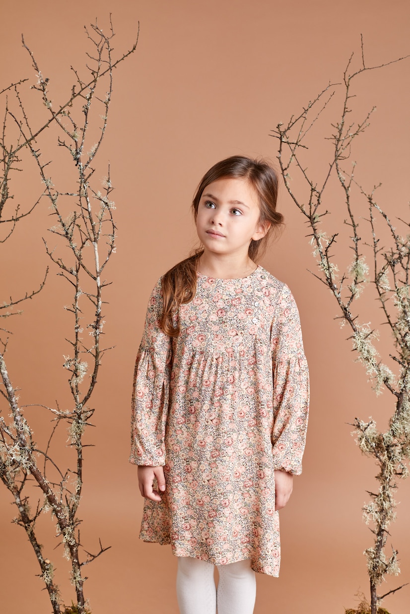 Это длинное платье от Tartine et Chocolat, украшенное сплошным цветочным принтом, выполнено в розовом цвете и обеспечивает свободный крой с круглым вырезом.
