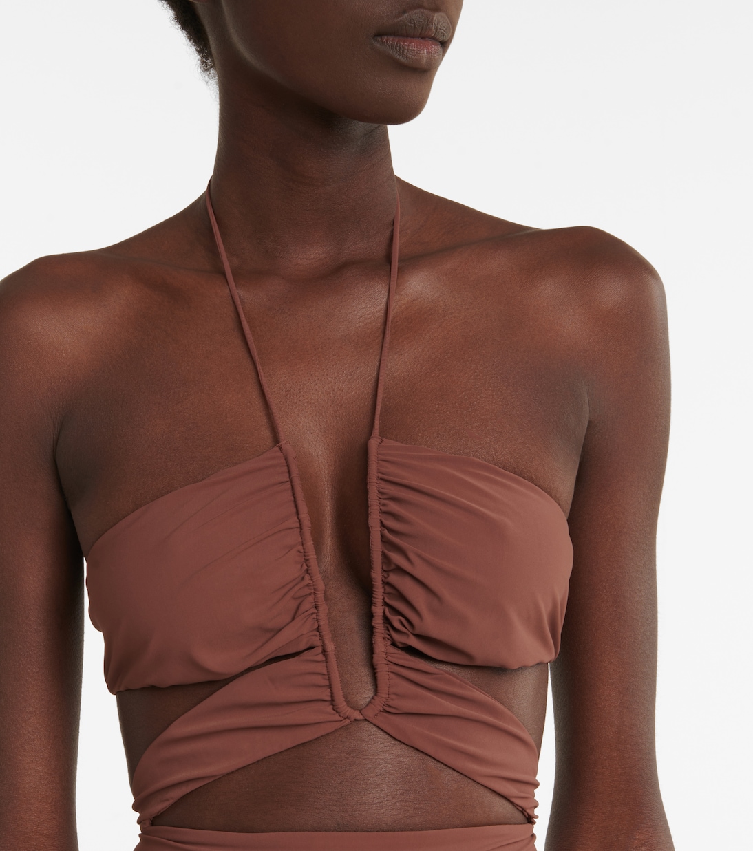Это коричневое мини-платье является частью первой эксклюзивной капсульной коллекции Нэнси Доджака для Mytheresa. В нем есть множество дизайнерских особенностей, таких как лиф в стиле бралетта, вырезы и приталенный силуэт.