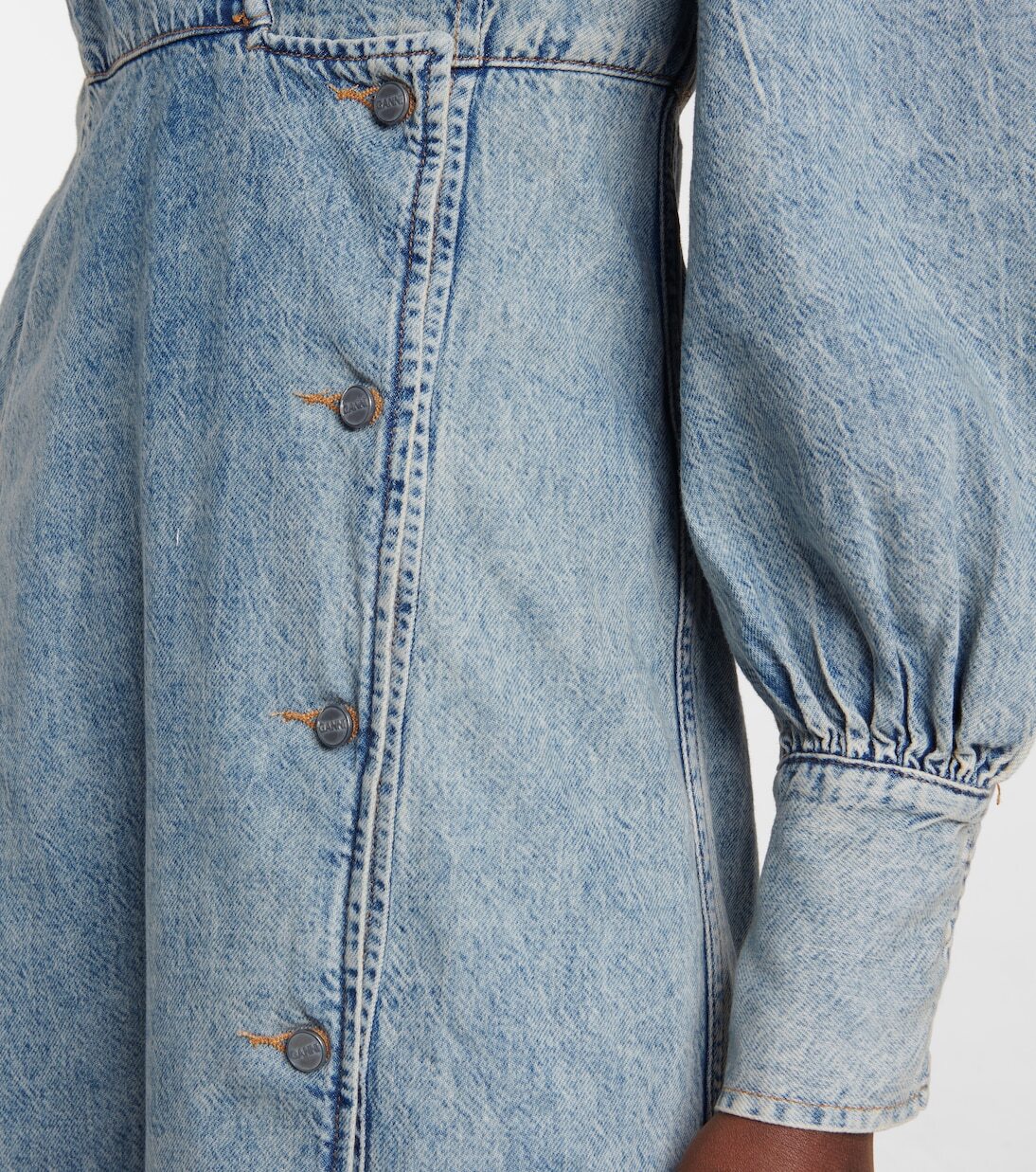 Это миди-платье от Ganni выполнено из денима с кислотной стиркой. Спереди - запах, V-образный вырез, застежка на пуговицы по бокам.