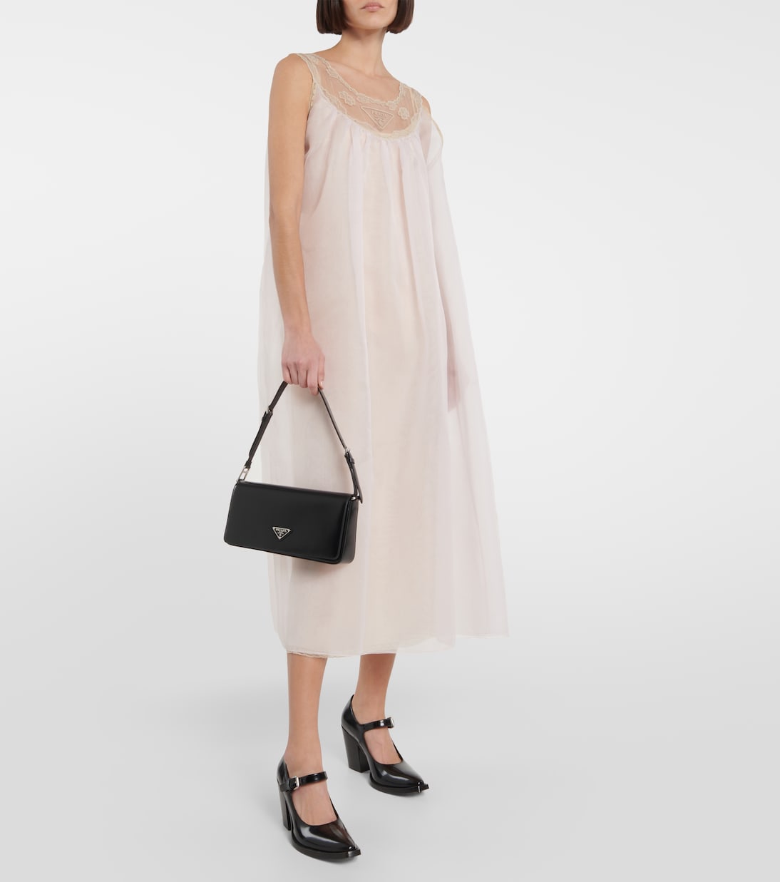 Это миди-платье от Prada - великолепное изделие с замысловатым кружевным вырезом, украшенным узнаваемым треугольным логотипом бренда.