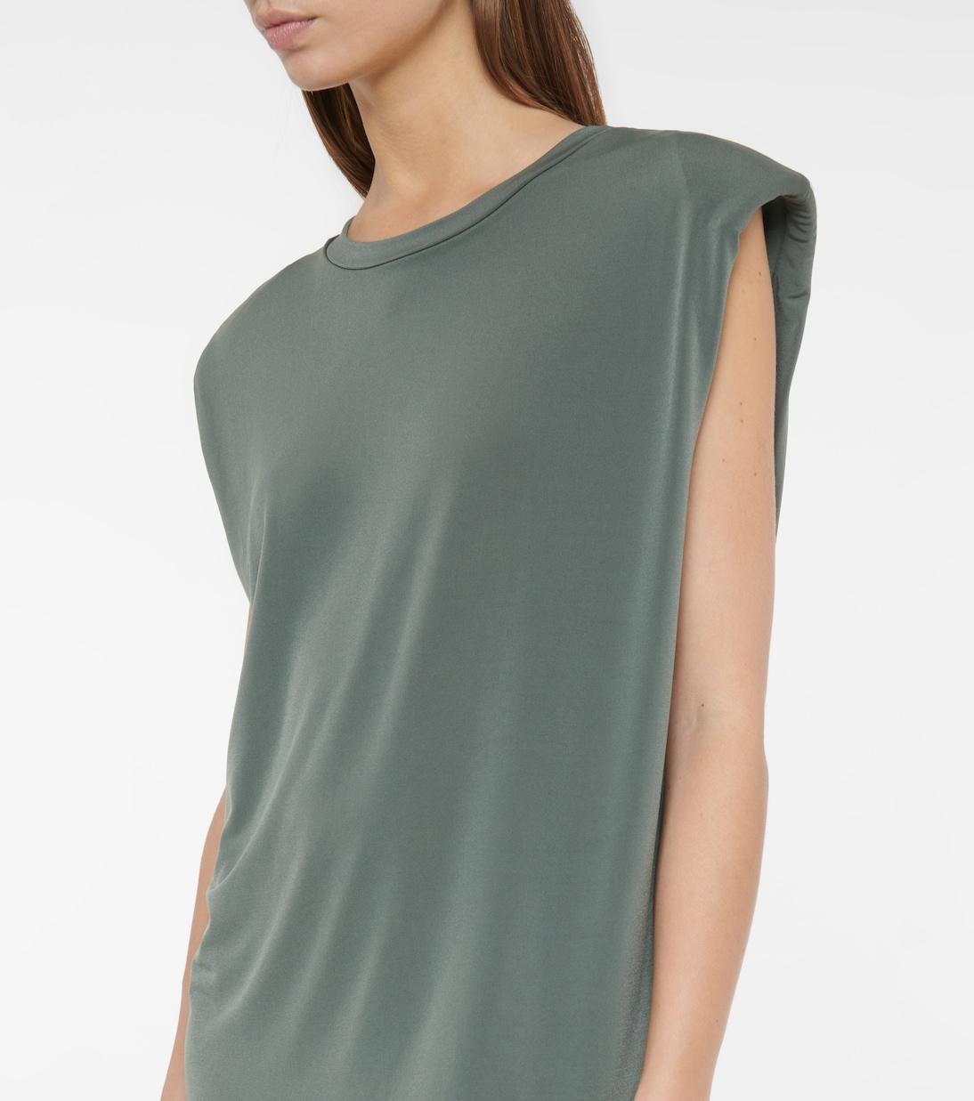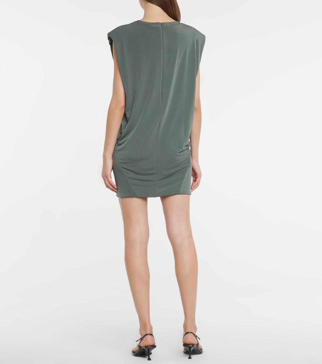 Это мини-платье Lanston Sport сшито из эластичного трикотажа цвета хаки, который струится как по волшебству. Круглый вырез горловины напоминает классические футболки, а подплечники подчеркивают фигуру.