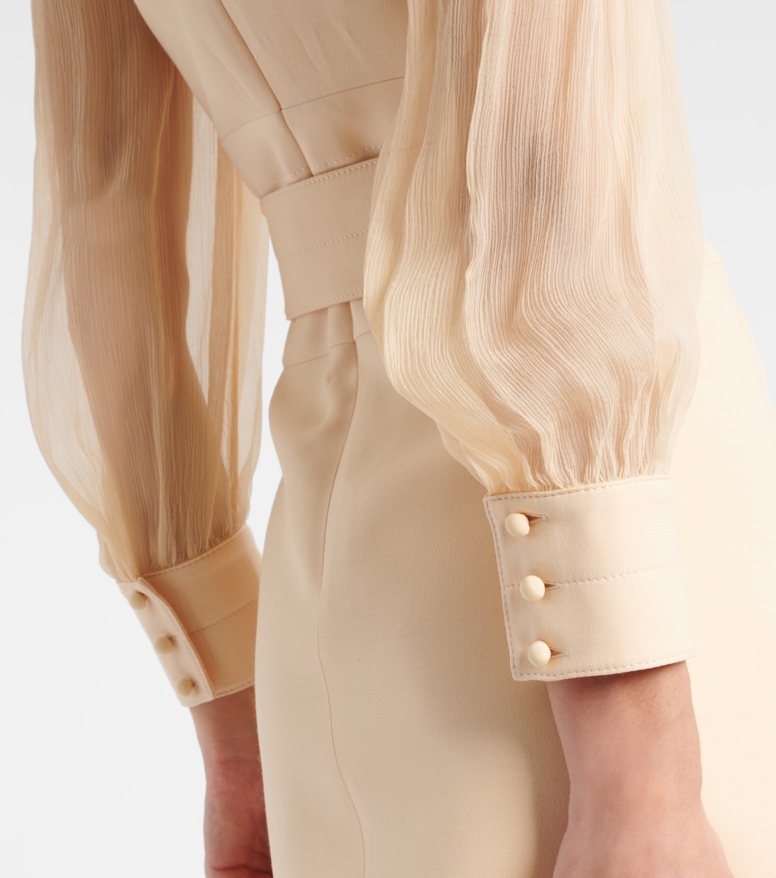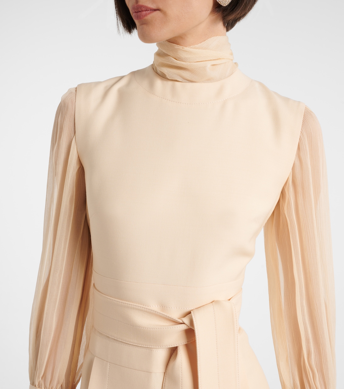 Это мини-платье Valentino выполнено из фирменной ткани бренда Crepe Couture - роскошной смеси шерсти и шелка, которая обеспечивает структуру и красивую драпировку. Этот элегантный дизайн характеризуется ложным вырезом горловины и съемным фирменным поясом.