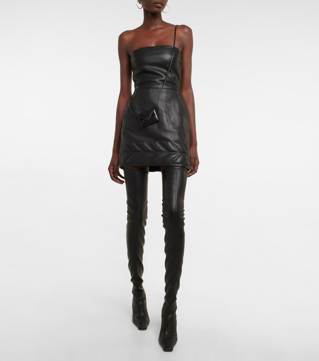 Это мини-платье без бретелек от David Koma выполнено из кожи с тисненым подолом.