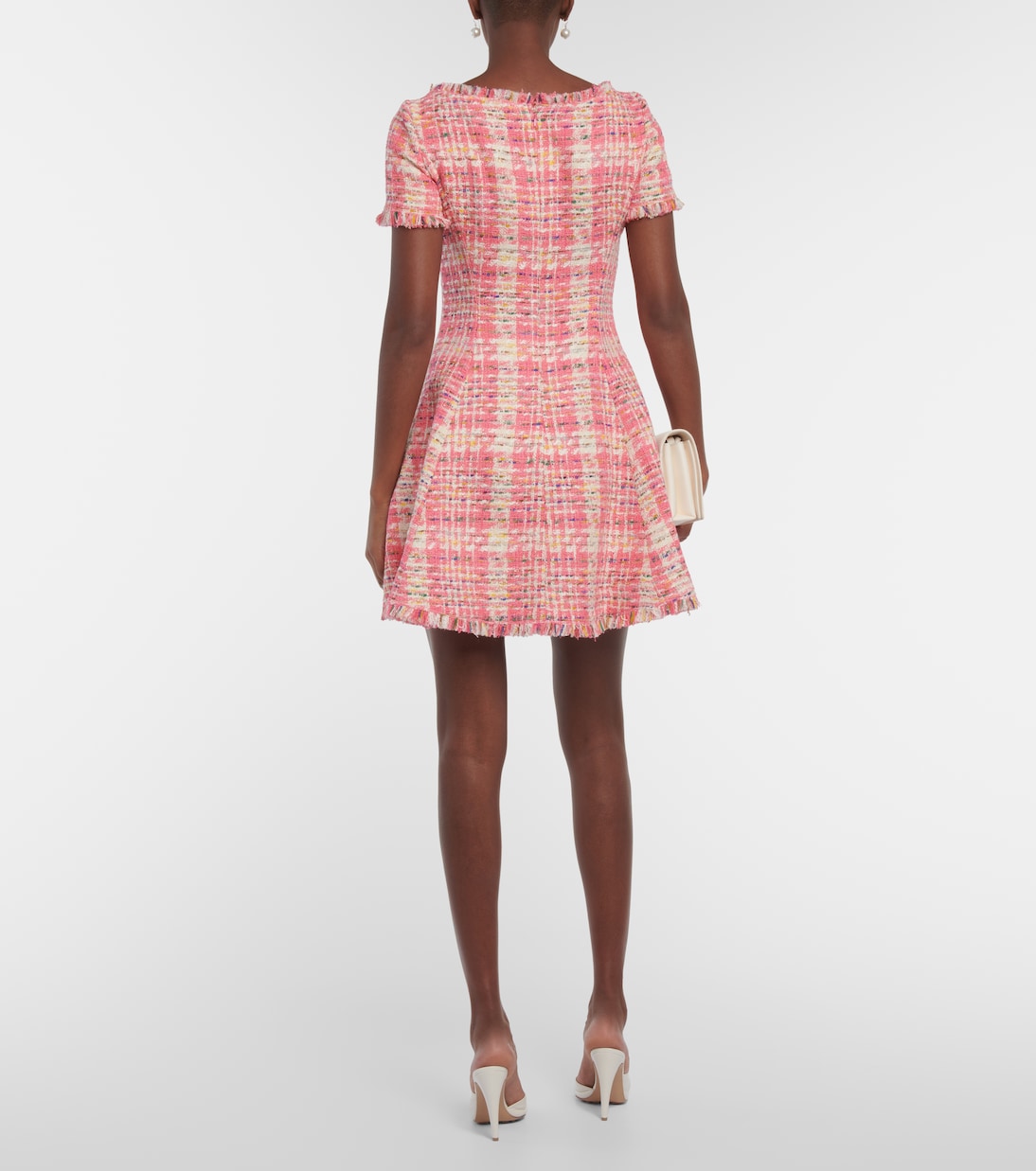 Это мини-платье от Oscar de la Renta сшито из клетчатого хлопкового твида и имеет приталенный и расклешенный силуэт. Круглый вырез, короткие рукава и бахрома.