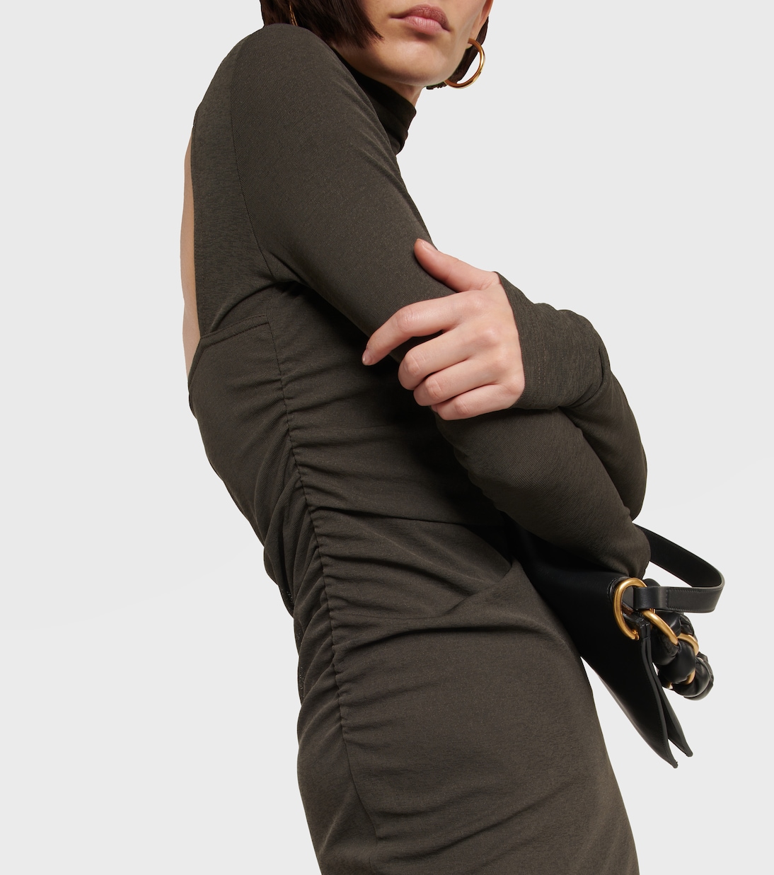 Это платье миди от Nanushka, выполненное из легкого трикотажа, имеет водолазку, открытую спину и разрезы по подолу.