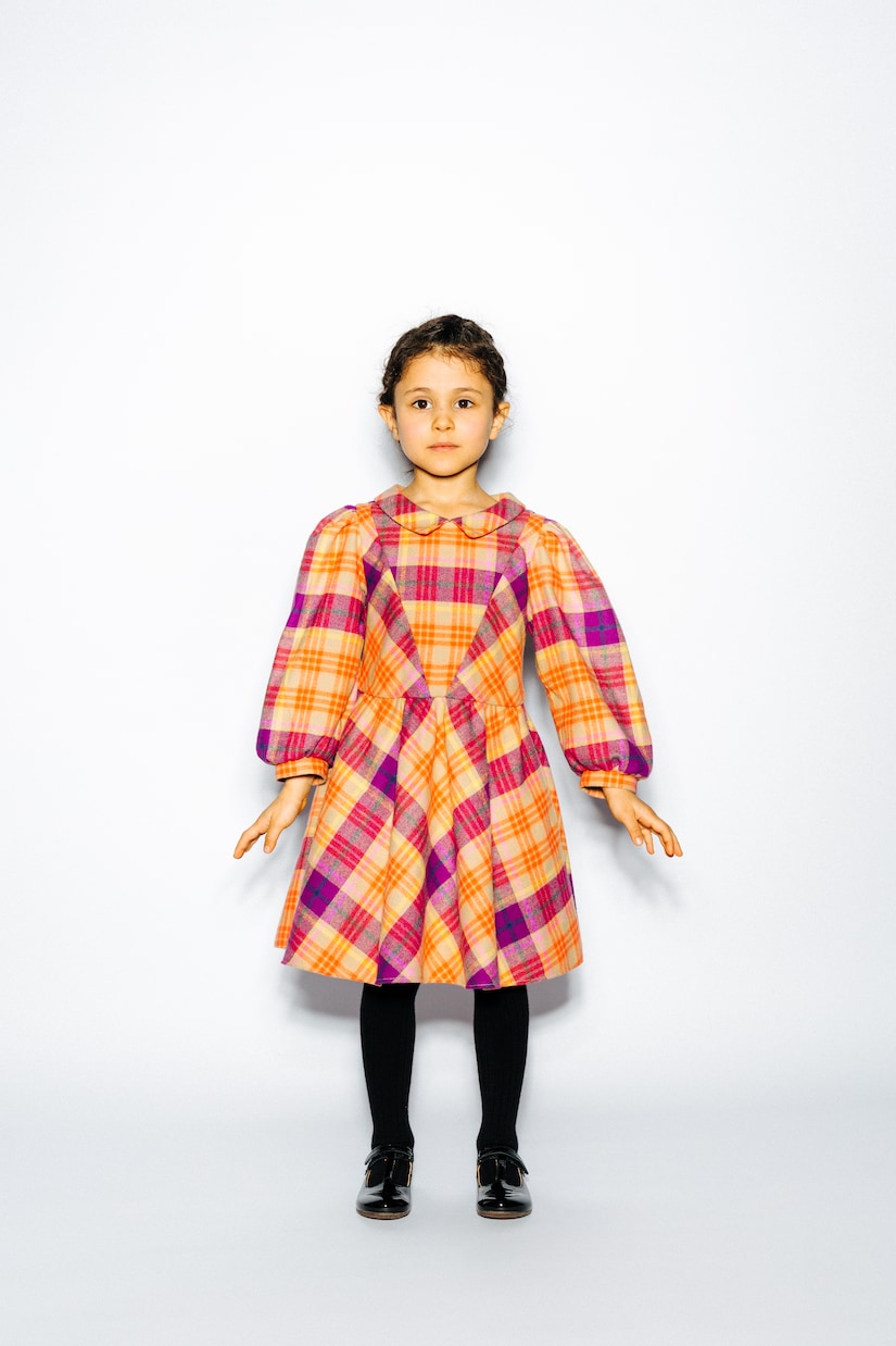 Это платье от Paade Mode с красивым воротником и рукавами-блузоном. Оно сшито из хлопка на подкладке с разноцветным рисунком в клетку.