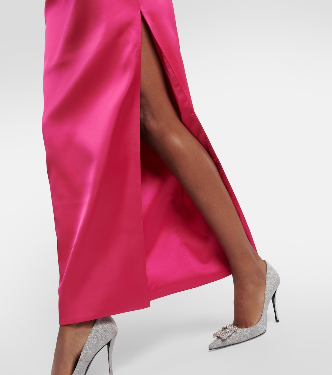 Это платье от Rasario станет шикарным вариантом для вашего следующего случая. Изготовлено из блестящего атласа, имеет приталенный силуэт, глубокий боковой разрез и изящный вырез с открытыми плечами, подчеркнутый тонкими бретельками.