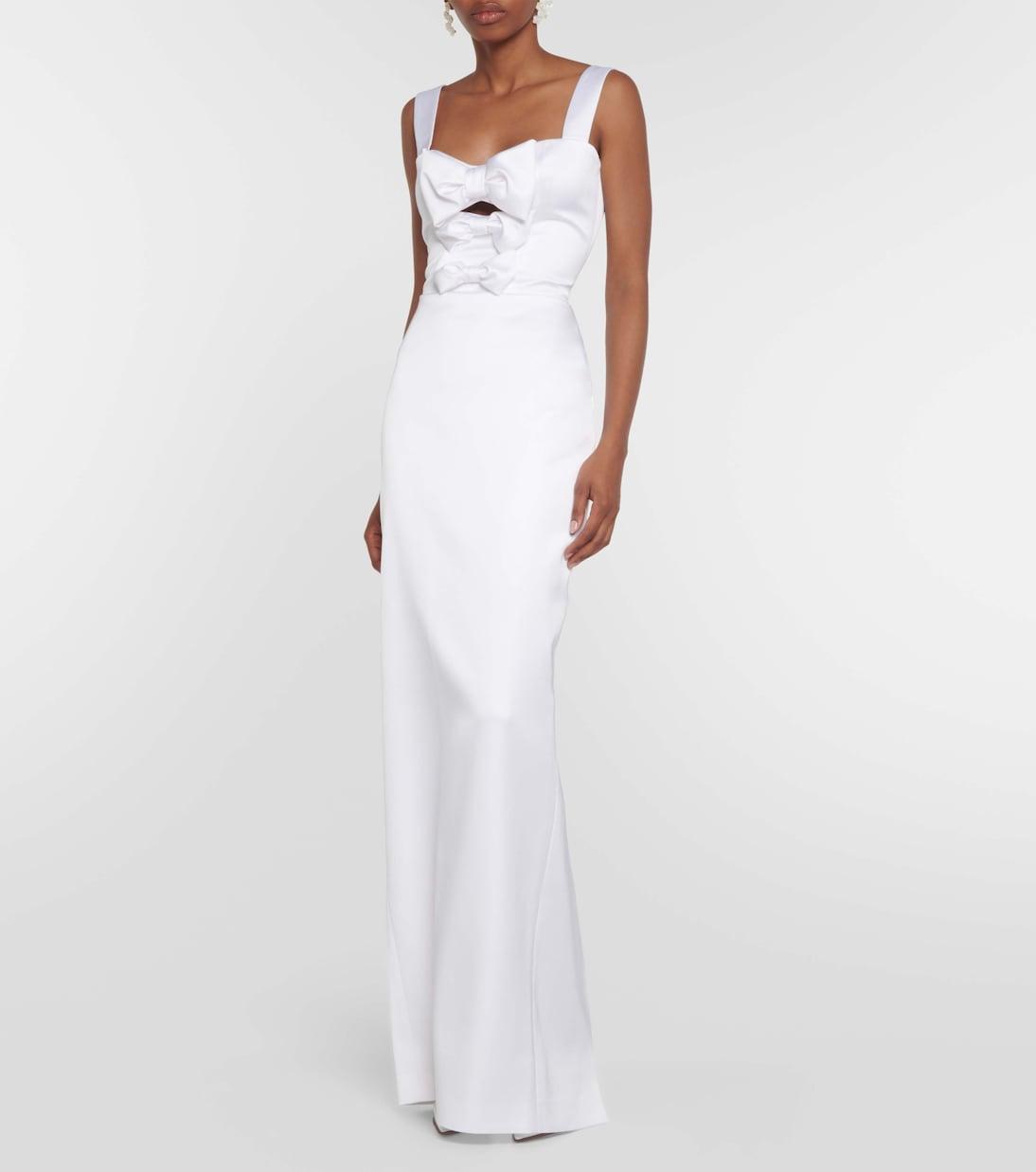 Это платье от Rasario, украшенное тремя скульптурными бантами, станет идеальным выбором для современной невесты. Искусно выполненное из блестящего атласа, оно имеет вырез в форме сердца, который изящно подчеркивается скромным вырезом.