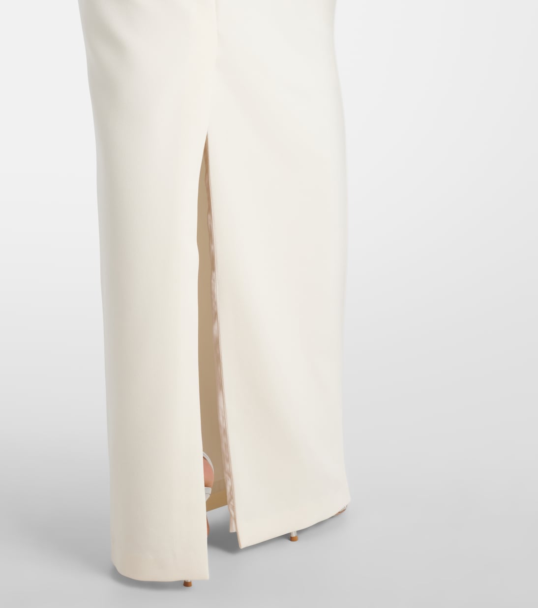 Это платье от Safiyaa, выполненное из фирменной плотной креповой ткани, украшено сверкающими кристаллами. Изделие имеет съемный пояс и прозрачный контрастный тюль на плечах, отделанный декоративными аппликациями.