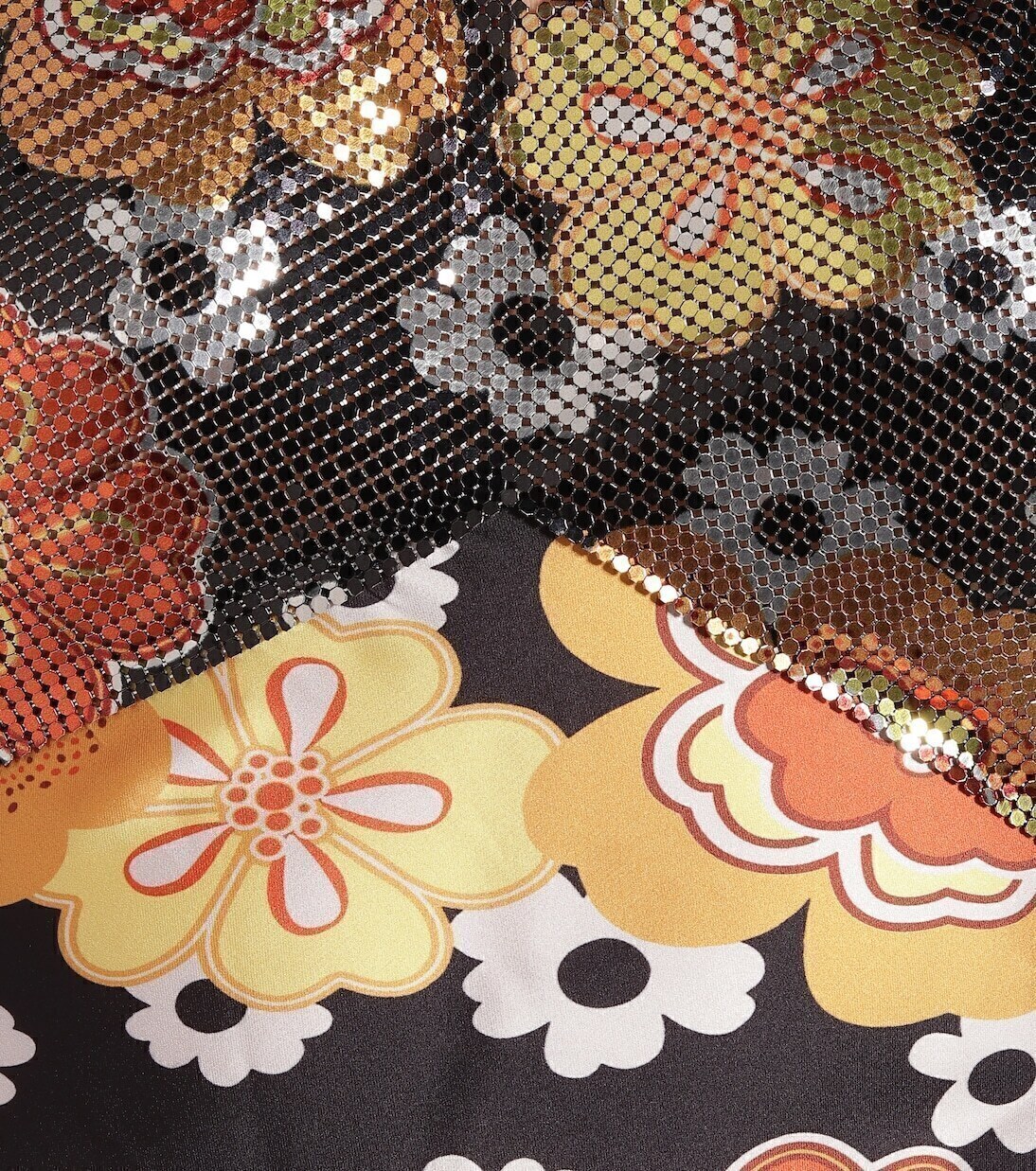 Это платье отсылает к архивам Paco Rabanne - постоянной теме нашей эксклюзивной капсульной коллекции с этим лейблом - кольчужная отделка, ниспадающая каскадом на плечи. 70-е годы стали источником вдохновения для Жюльена Доссены при создании этой модели, что объясняет ее оранжевый цветочный принт в ретро-стиле.