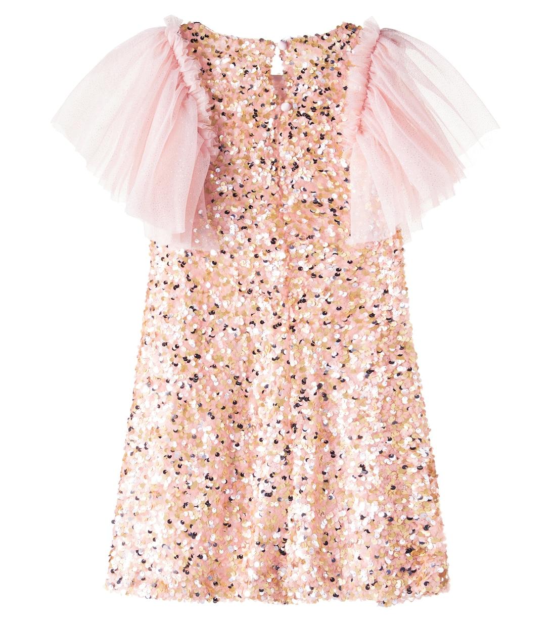 Это платье цвета розового золота от Patachou создано для девушек, которые ищут волшебства. Оно украшено рукавами с оборками и пайетками по всей длине.