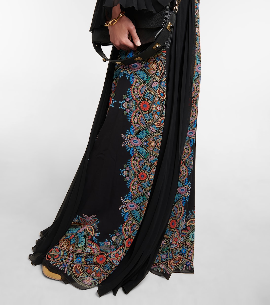 Это платье, сделанное в Италии, украшено ярким цветочным принтом и узором пейсли, что является квинтэссенцией стиля Etro. Высокий ворот выполнен из нескольких слоев тонкого черного жоржета с четкими складками по всей юбке и рукавам. Он отделан нежными оборками и имеет открытую спину.