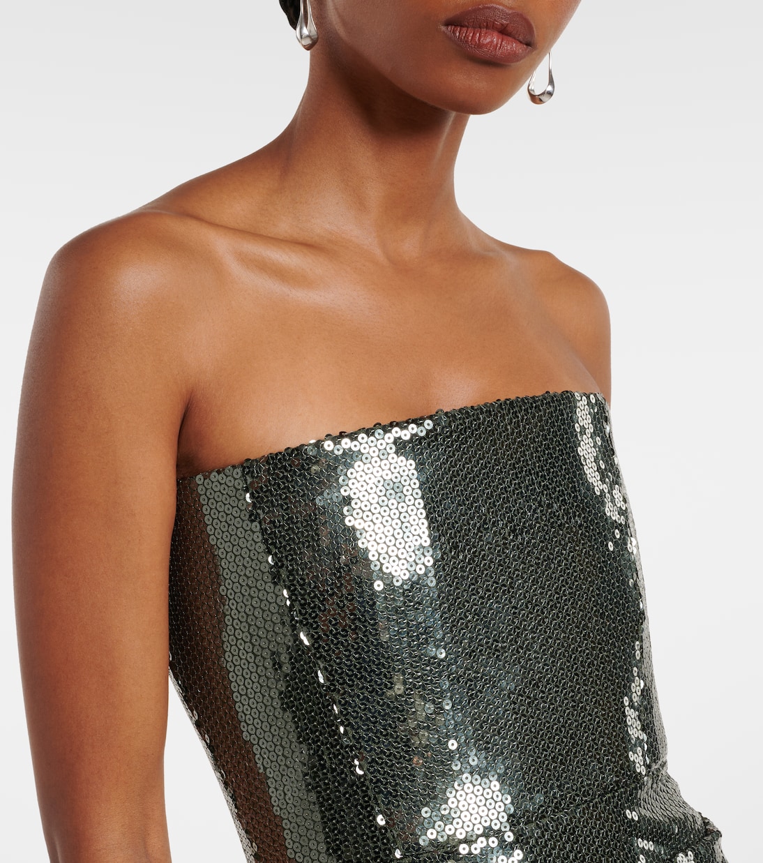 Это платье-корсет без бретелек от Алекса Перри поражает асимметричной драпировкой на бедрах и отделкой из пайеток по всей поверхности. Изделие разработано с силуэтом, подходящим для ковров, и застегивается на молнию сзади.