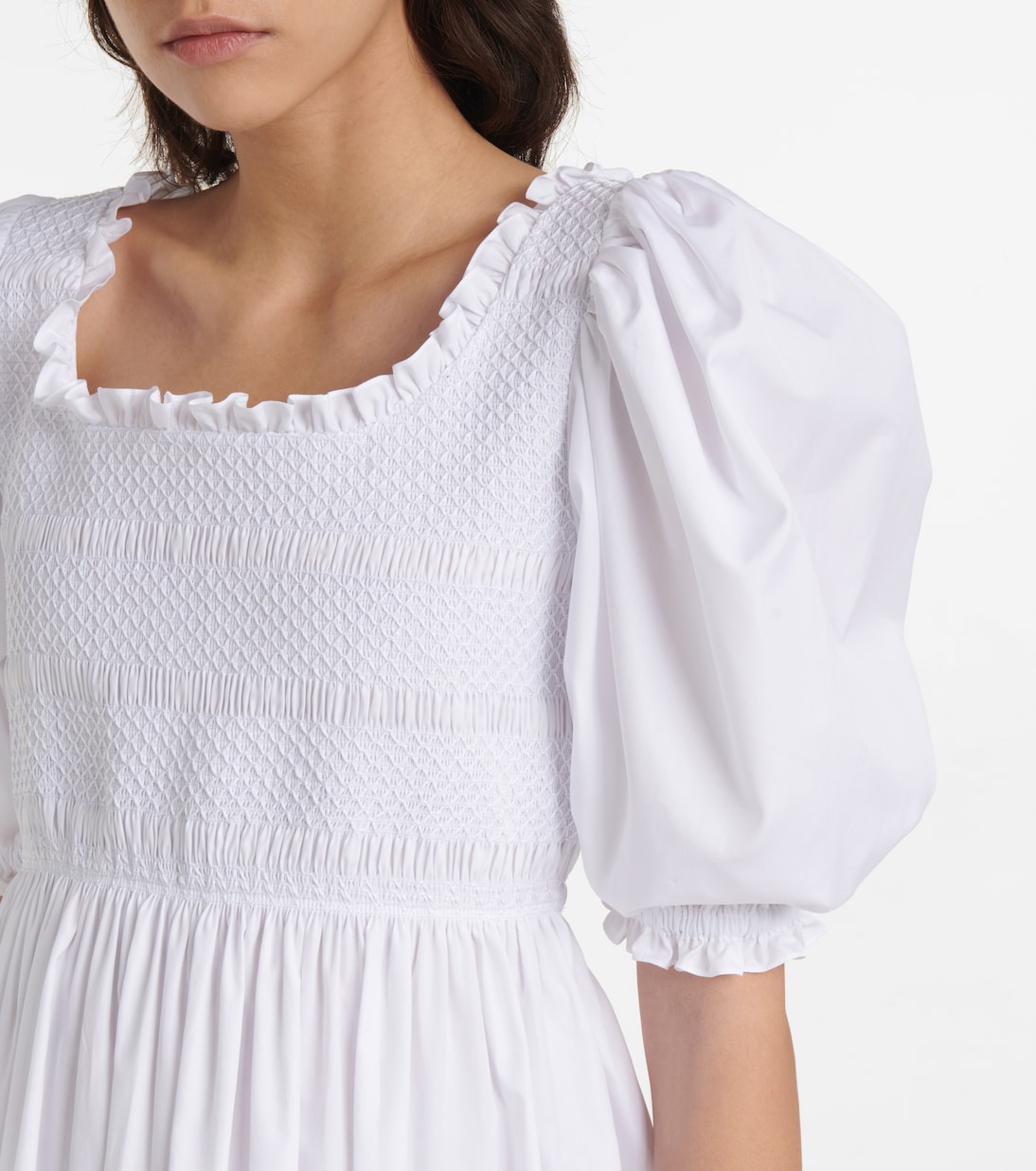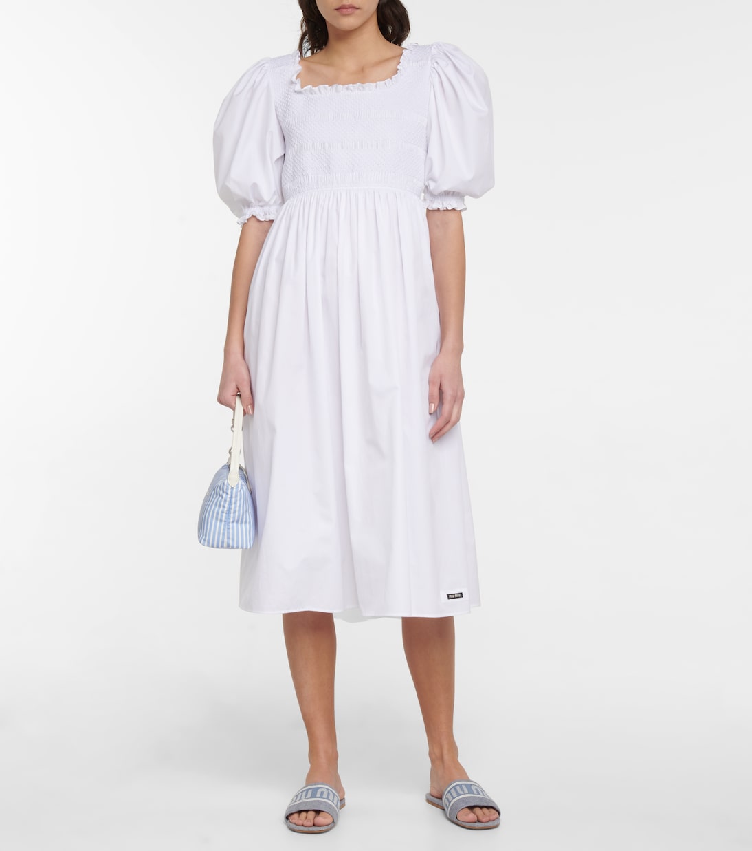 Это хлопковое платье миди от Miu Miu с рукавами-фонариками и завязками на спине представляет собой очаровательный дизайн с головы до ног. Платье облегающего кроя с расклешенным лифом, вышитым сборками и отделкой рюшами.
