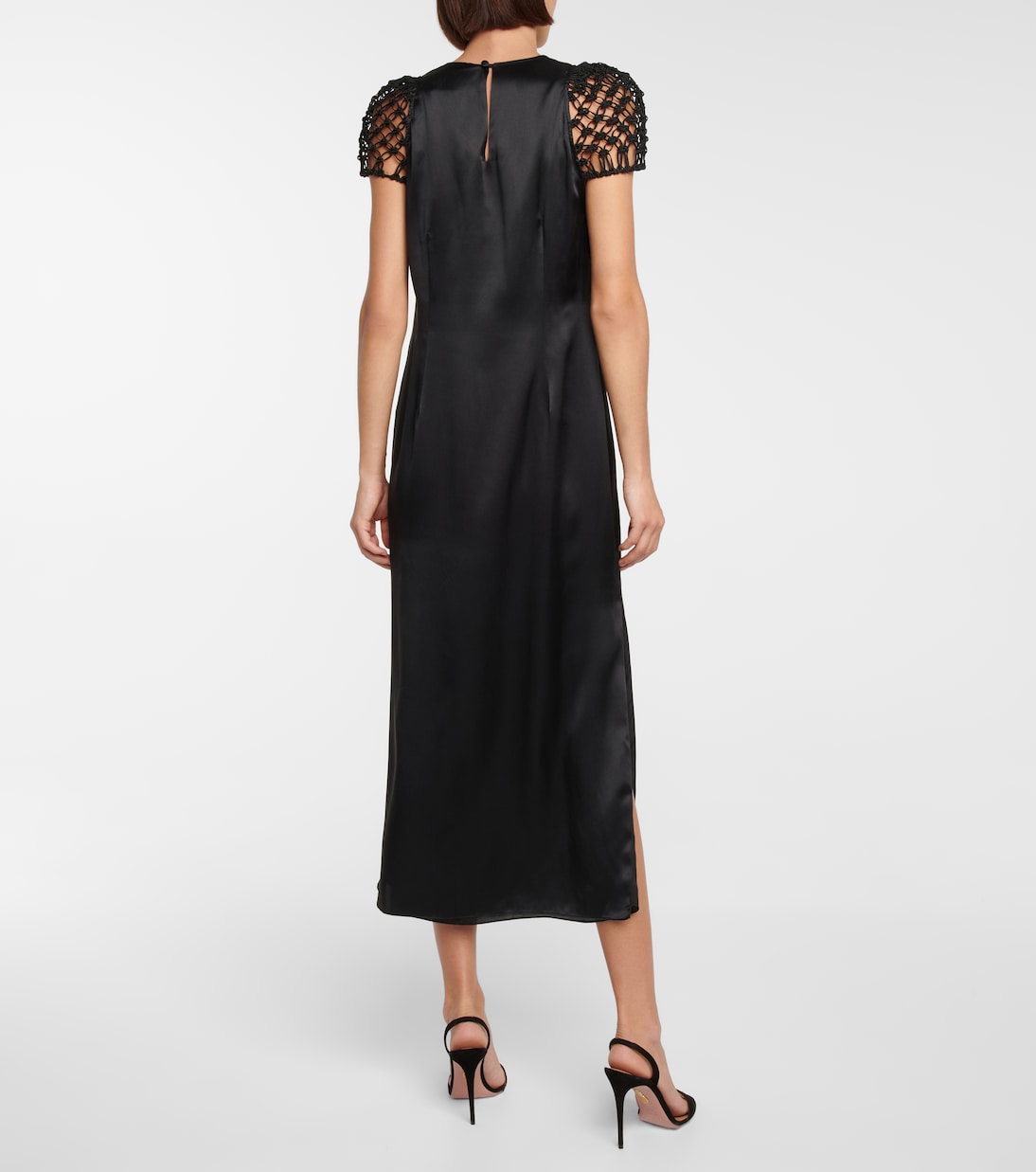 Это черное платье миди Audun от Safiyaa, выполненное из блестящего шелкового атласа, имеет рукава-крылышки и скрученный перед, привлекающий внимание к груди.