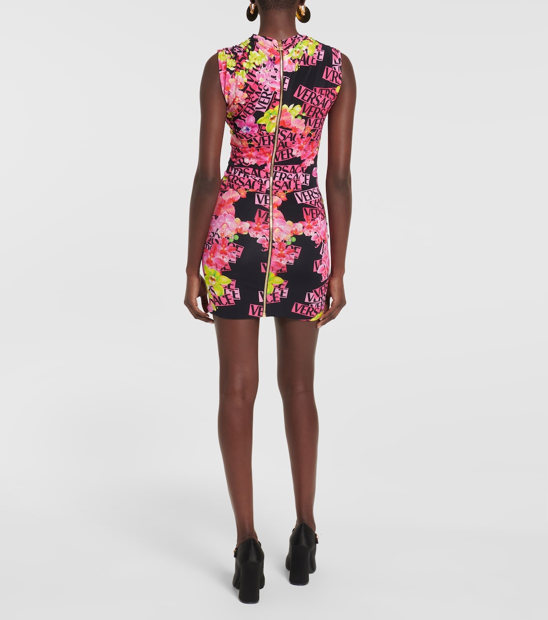 Это яркое мини-платье воплощает в себе самобытный стиль Versace. Изготовлено из облегающего трикотажа, украшенного цветочным принтом гибискуса и буквами логотипа, а также имеет обернутый вырез, создающий драпировку.
