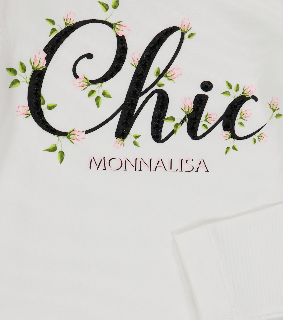 Этот белый топ от Monnalisa, украшенный черными кристаллами, подчеркивающими мотив Chic на груди, изготовлен в Италии из мягкого и комфортного эластичного хлопкового трикотажа.