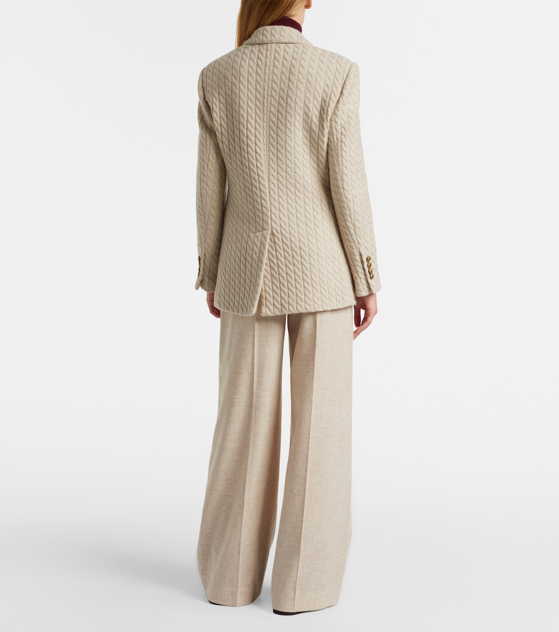 Этот блейзер, связанный косами из теплого кашемира, представляет собой переосмысление классического кроя в фирменном стиле Brunello Cucinelli. Острые лацканы, подплечники, двубортная застежка и изящная цепочка Мониль подчеркивают вневременную элегантность этого дизайна.