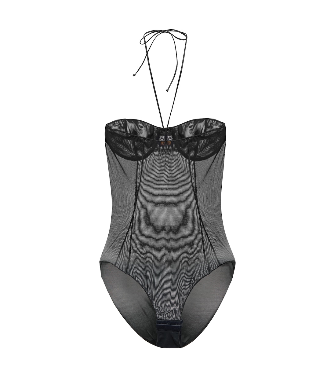 Этот боди от Oséree выполнен из прозрачной сетки классического черного цвета. Чашечки на косточках и завязка на шее.