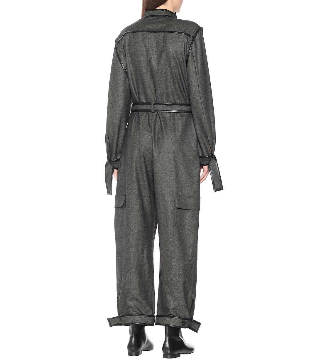 Этот зелено-серый меланжевый комбинезон от Stella McCartney, представленный на подиуме коллекции осень-зима 2020, создает эффектный силуэт. Он выполнен из легкой шерсти и отделан искусственной кожей Skin-Free-Skin, фирменной технологией бренда. Дополненный широкими штанинами и карманами-карго, он добавит утилитарного вида рабочей одежде.