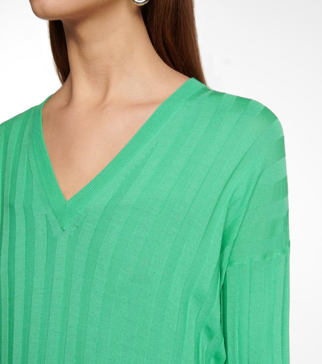 Этот зеленый свитер от Plan C легкий, поэтому он отлично подойдет для вашего гардероба, не связанного с сезоном. Сшитый в Италии из шерстяного трикотажа с широкой резинкой, создающей эффект тональных полос, этот свитер имеет свободный силуэт со спущенными плечами, что делает его идеальным для многослойного ношения. Пусть V-образный вырез обрамляет эффектный воротник.