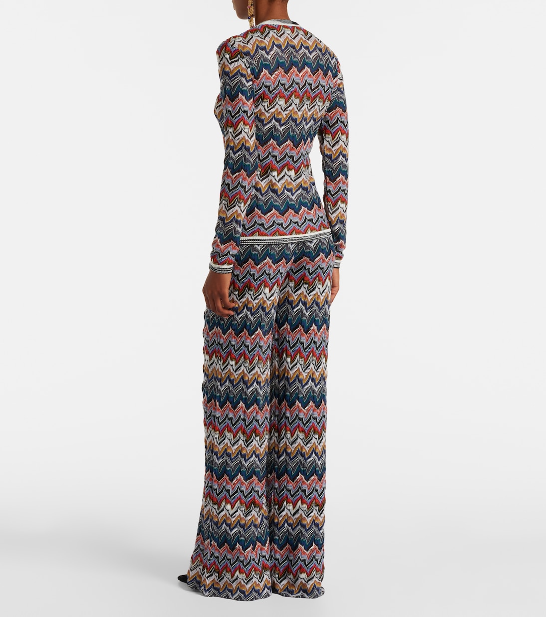 Этот кардиган Missoni, отличающийся смелым и изысканным характером, изготовлен из фирменных нитей ламе бренда. Яркий зигзагообразный узор подчеркивает V-образный вырез, придавая ансамблю интересную живость.