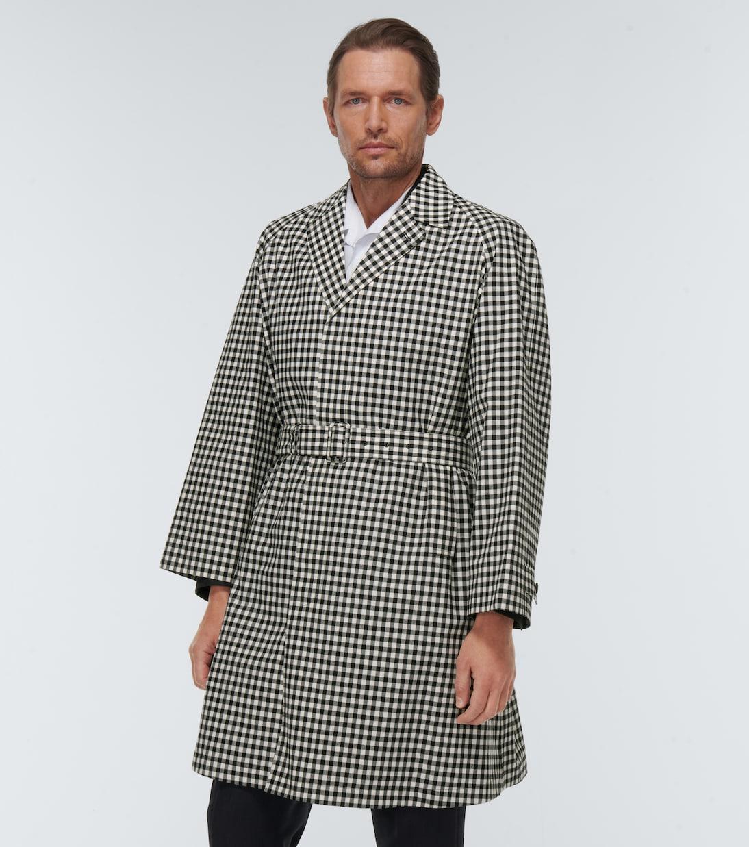 Этот клетчатый тренчкот, воплощающий элегантный подход Prada, имеет лаконичный цельнокроеный фасон. Эта хлопковая модель с заостренным воротником и поясом на талии обеспечивает универсальность стиля.