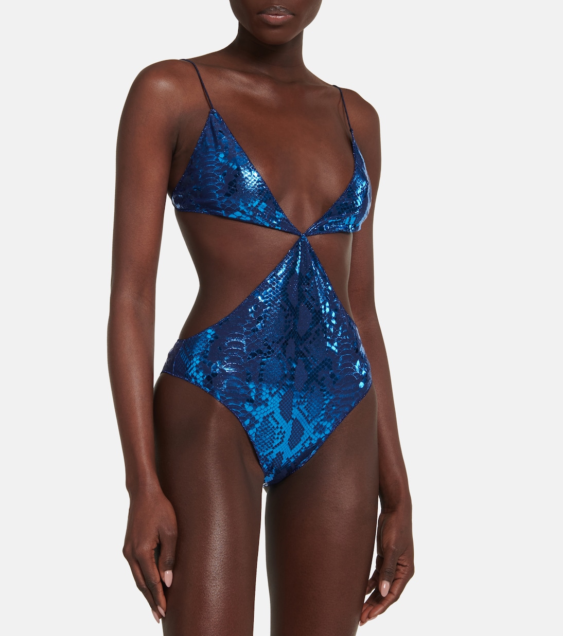 Этот купальник Oséree, изготовленный в Италии, отличается выразительными вырезами на талии, глубоким V-образным вырезом и тонкими бретельками. Металлический дизайн дополнен принтом в виде змеи по всей поверхности и обеспечивает минимальную застежку.
