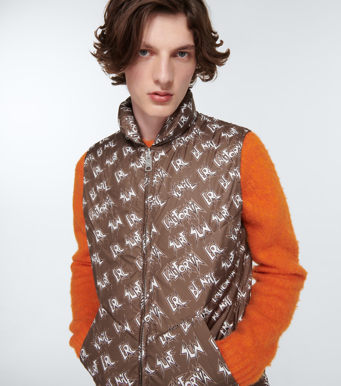 Этот пуховый жилет от Erl изготовлен из технического материала темно-коричневого тона с принтом логотипа по всей поверхности.