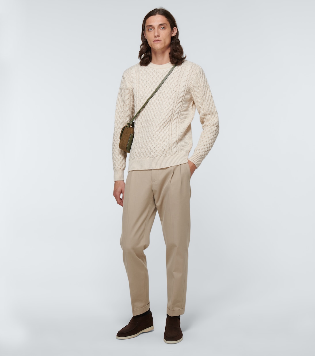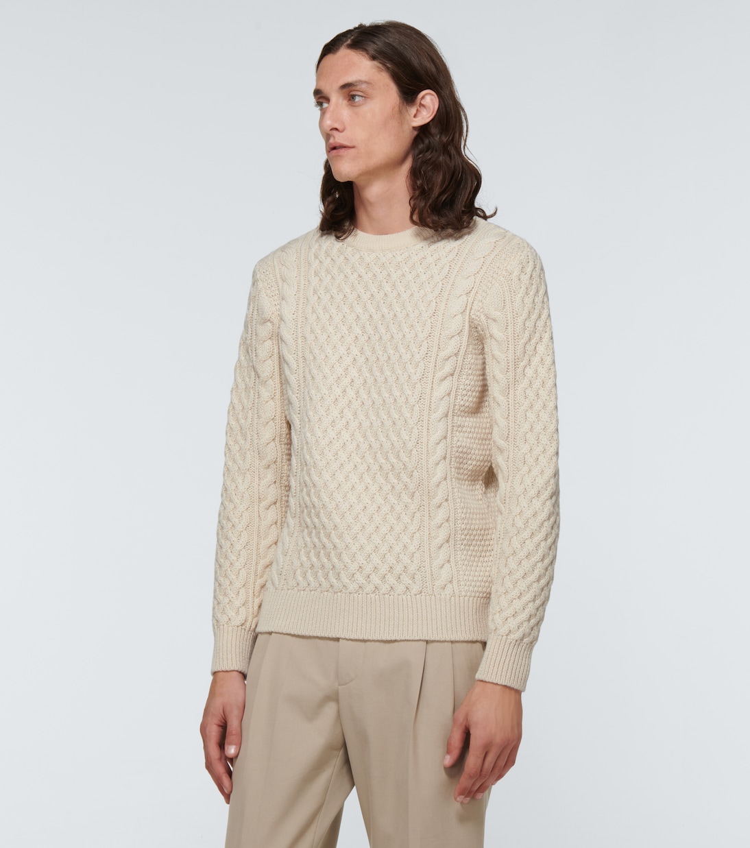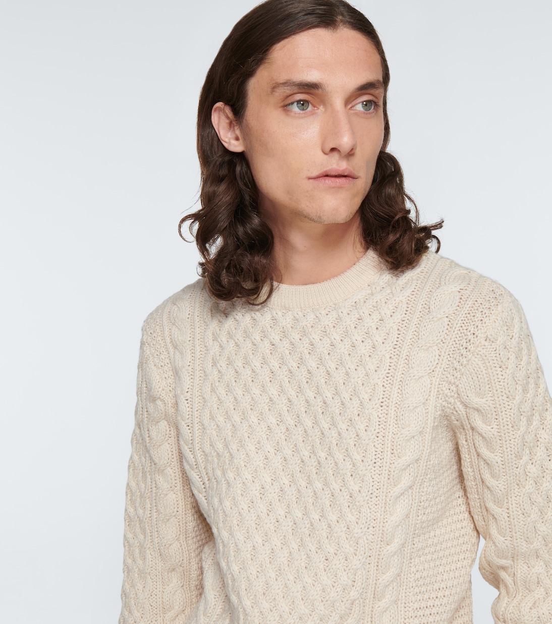 Этот свитер цвета экрю с круглым вырезом от Sunspel, изготовленный из шерсти мериносовых овец, имеет свободный крой, ребристую отделку и прочный узор кос, отсылающий к традиционному рыбацкому стилю.