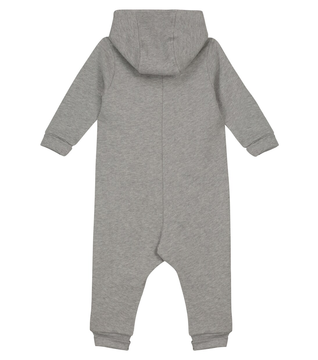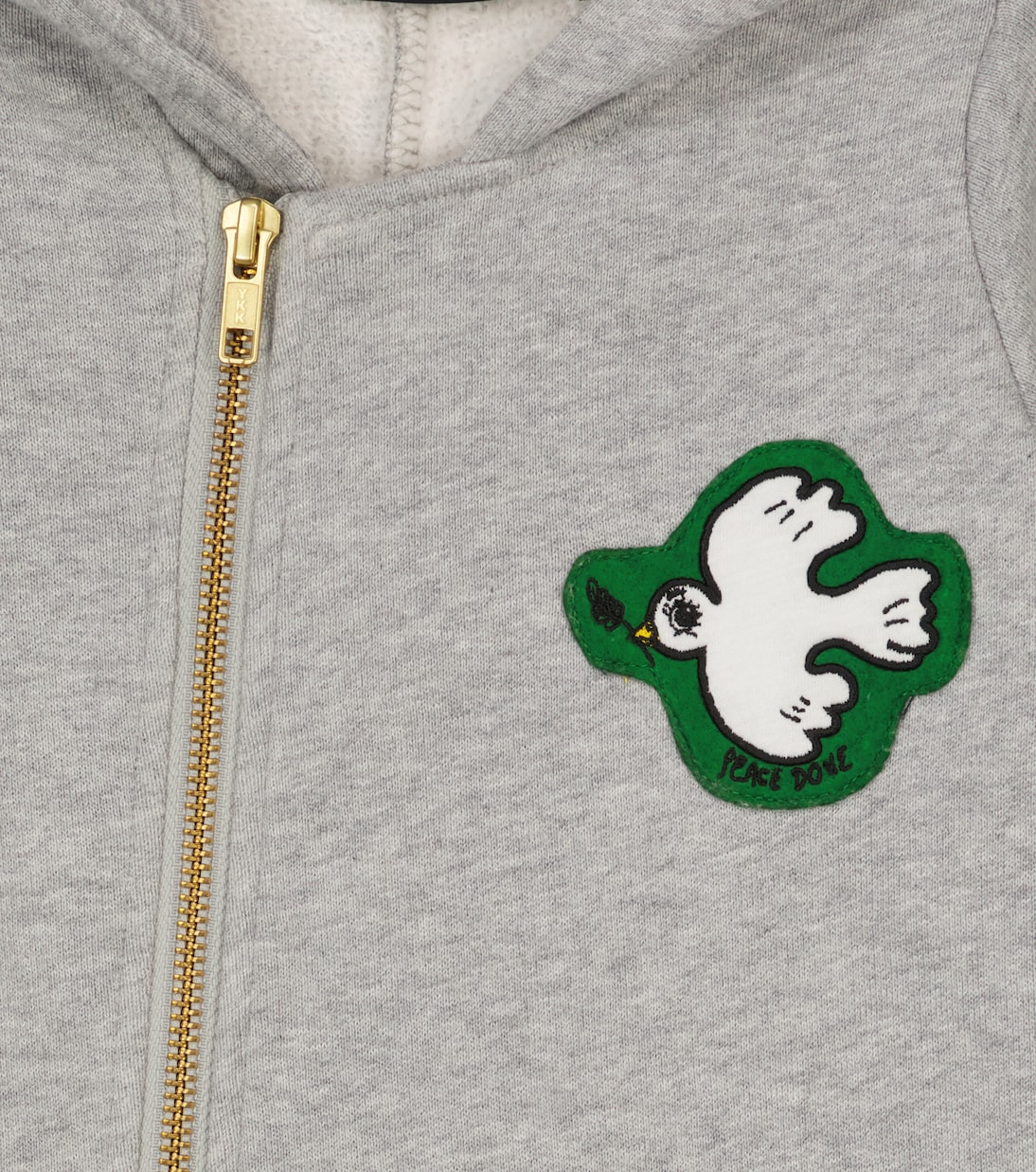 Этот серый комбинезон для малышей Mini Rodini изготовлен из хлопка, с капюшоном, застежкой-молнией золотистого тона и вышитой нашивкой в виде голубя на груди.