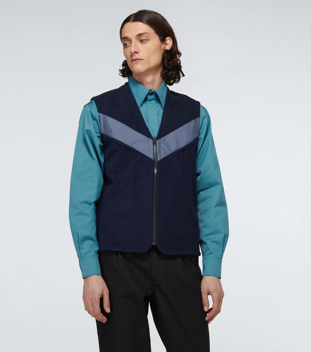 Этот темно-синий ветрозащитный жилет от GR10K по форме напоминает транспортную спецодежду, имеет молнию спереди и контрастную полоску из огнестойкой ткани GORETEX PYRAD, которую часто можно увидеть на форме правоохранительных органов.