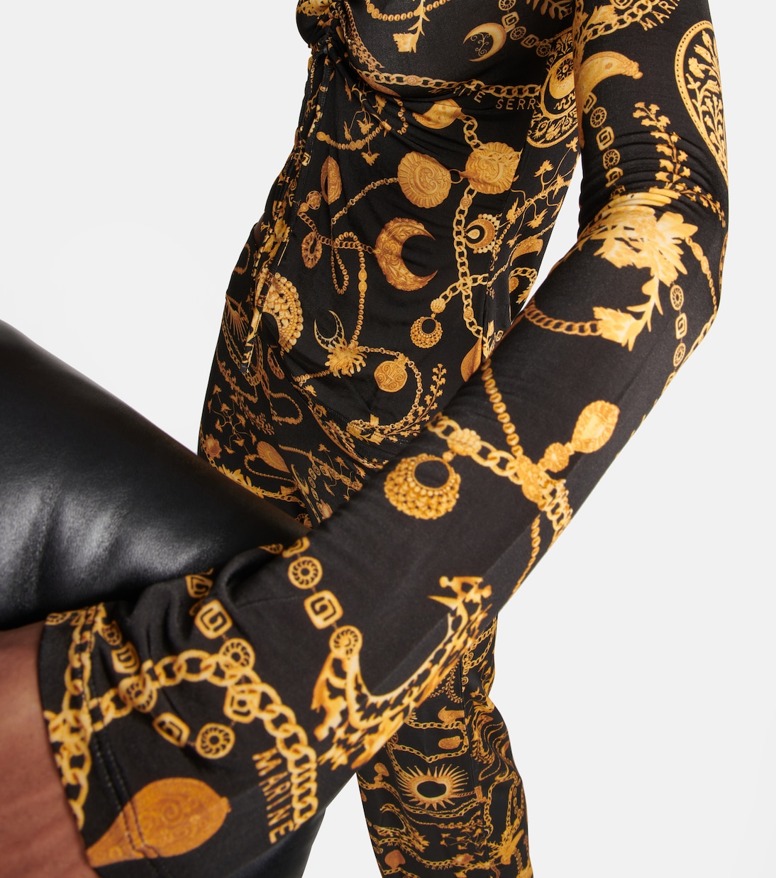 Этот топ от Marine Serre имеет сборку спереди, созданную с помощью регулируемого шнурка-завязки. Модель с длинными рукавами, рассчитанная на стандартную посадку, украшена эффектным черно-золотым орнаментом по всей поверхности.