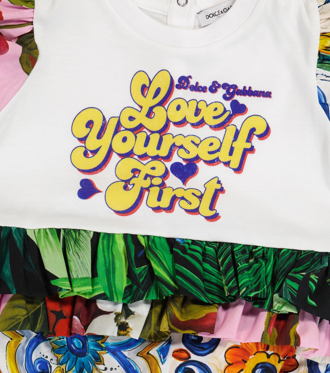 Этот хлопковый боди от Dolce & Gabbana станет радостным дополнением к детской коллекции. Заимствованная у взрослых с ее оборчатым принтом Patchwork di Sicilia и присборенными рукавами-крылышками, эта модель несет на себе мощный слоган, который подойдет всем нам, независимо от возраста.