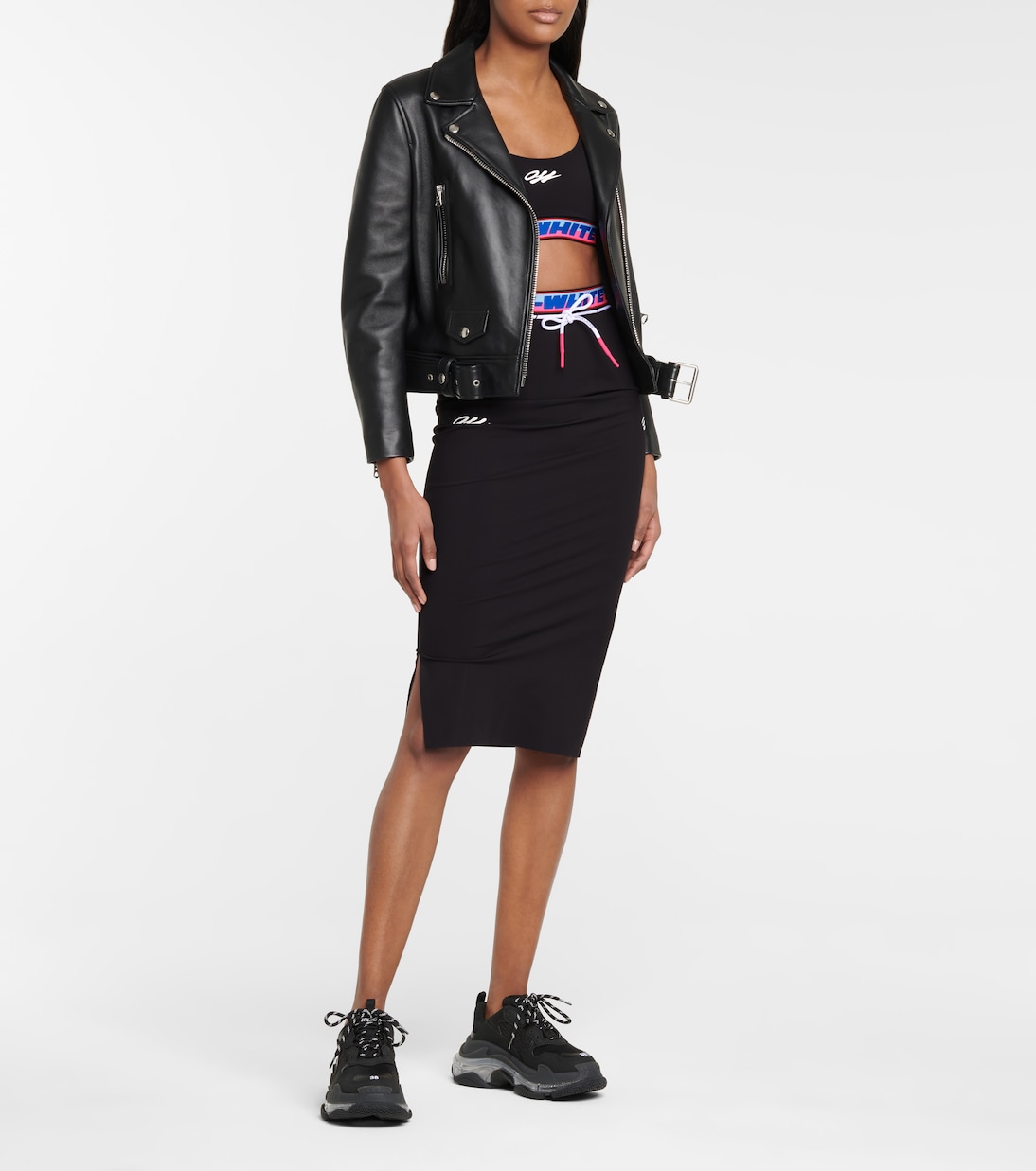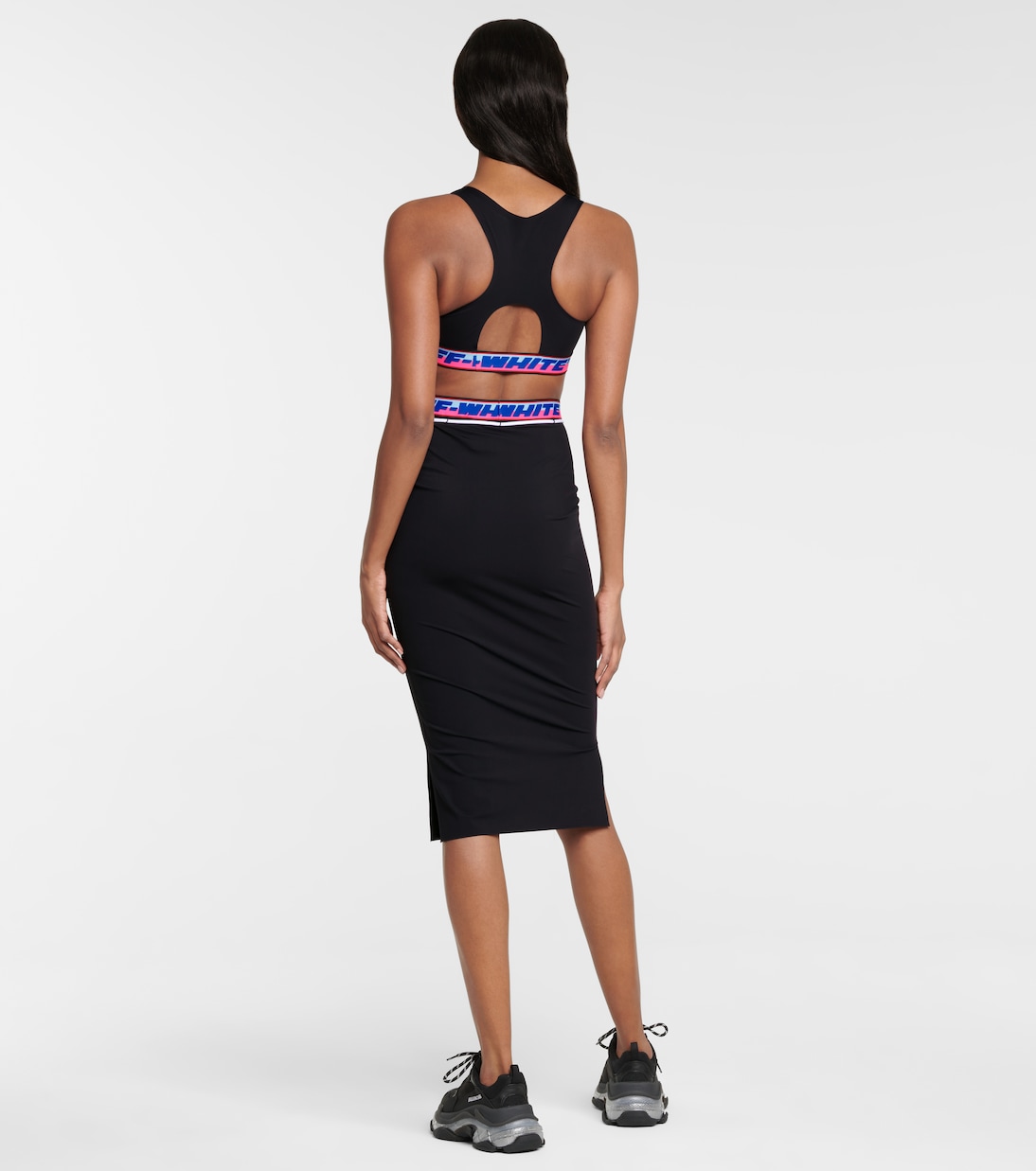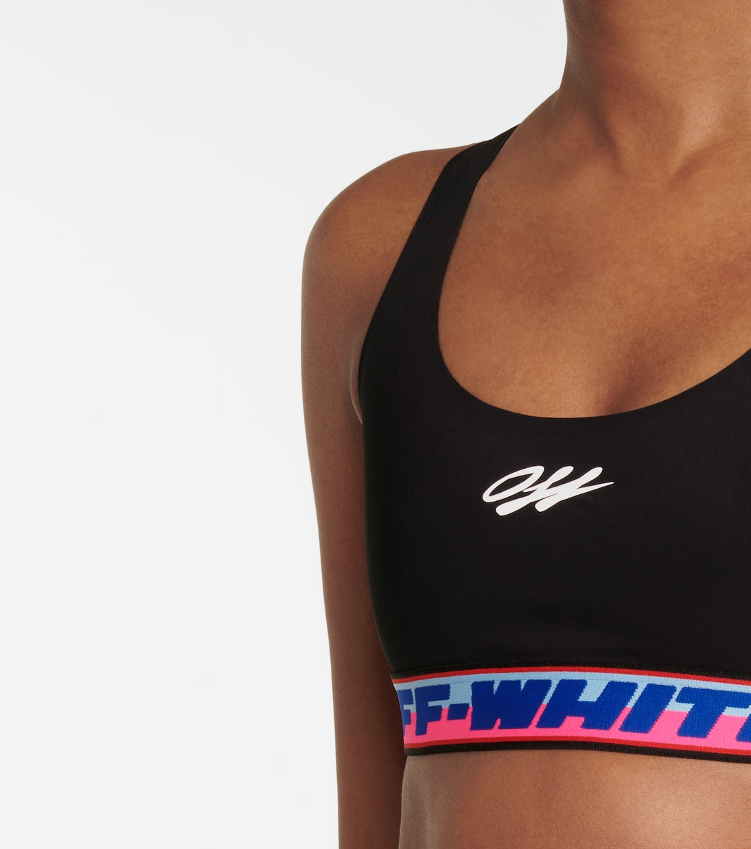 Этот черный спортивный бюстгальтер от Off-White подойдет как для тренировок, так и для придания спортивного стиля повседневным образам. Он изготовлен из легкой эластичной ткани, отличается контрастной полосатой линией под лифом с логотипом и спортивной спинкой-борцовкой, обеспечивающей свободу движений. Наденьте его под блейзер для создания стильного образа в темное время суток.