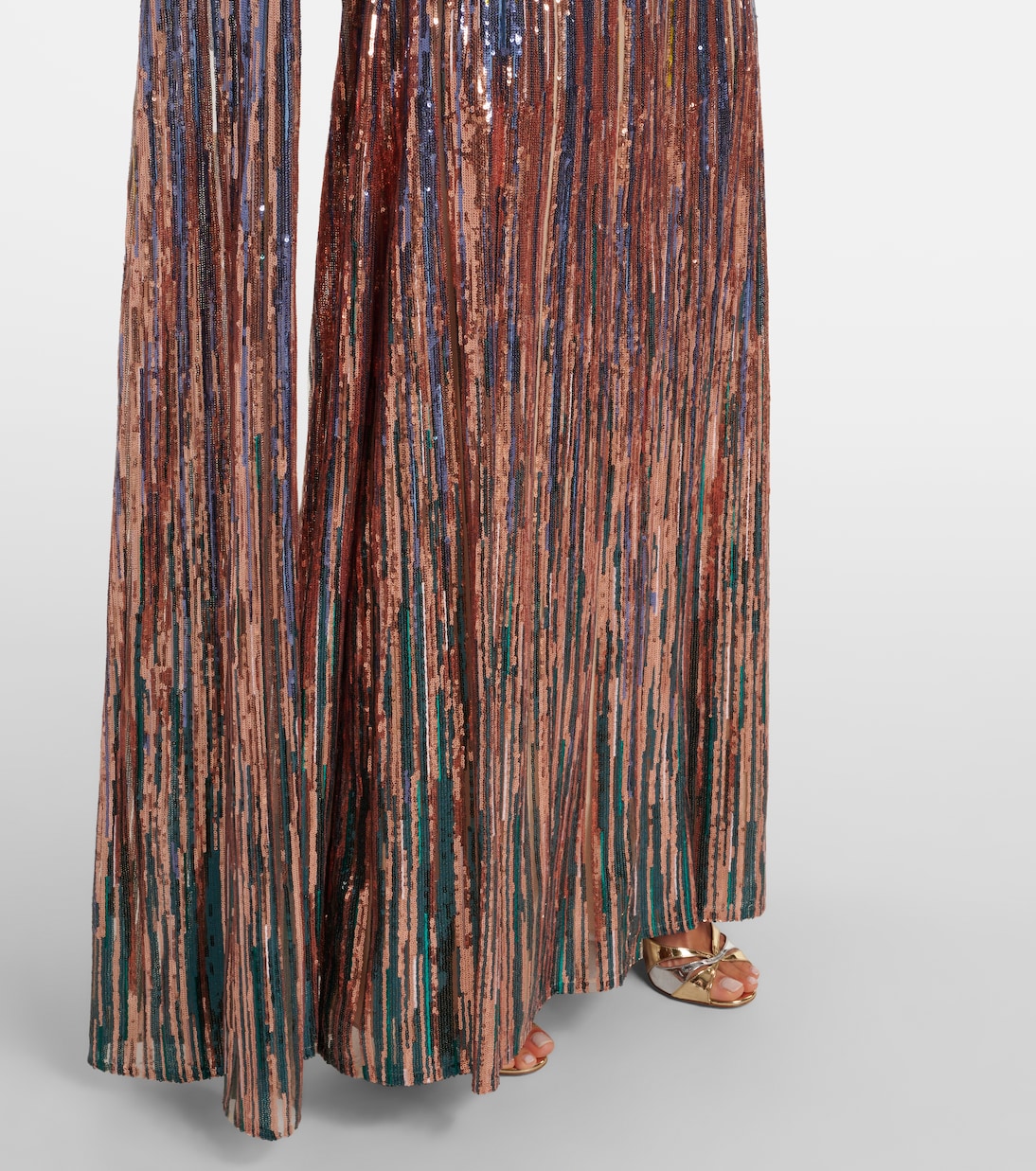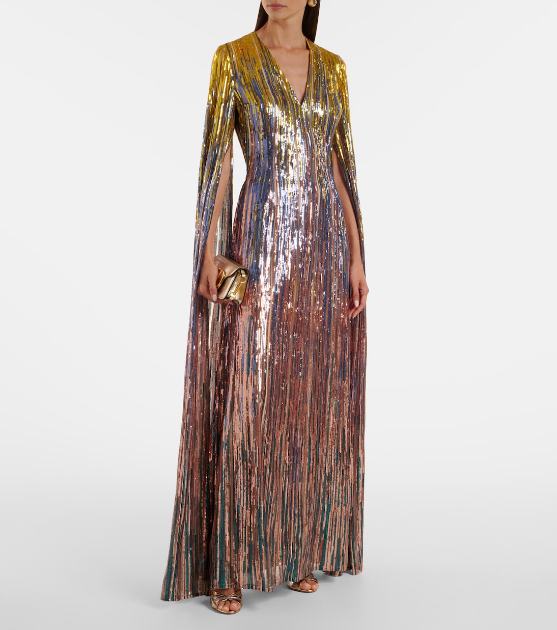 Эффектные творения Эли Сааба доказывают, что правильный наряд может сделать особое событие еще более запоминающимся. Это платье источает гламур с яркой отделкой из пайеток с эффектом градиента, струящимися рукавами-накидкой и глубоким V-образным вырезом.