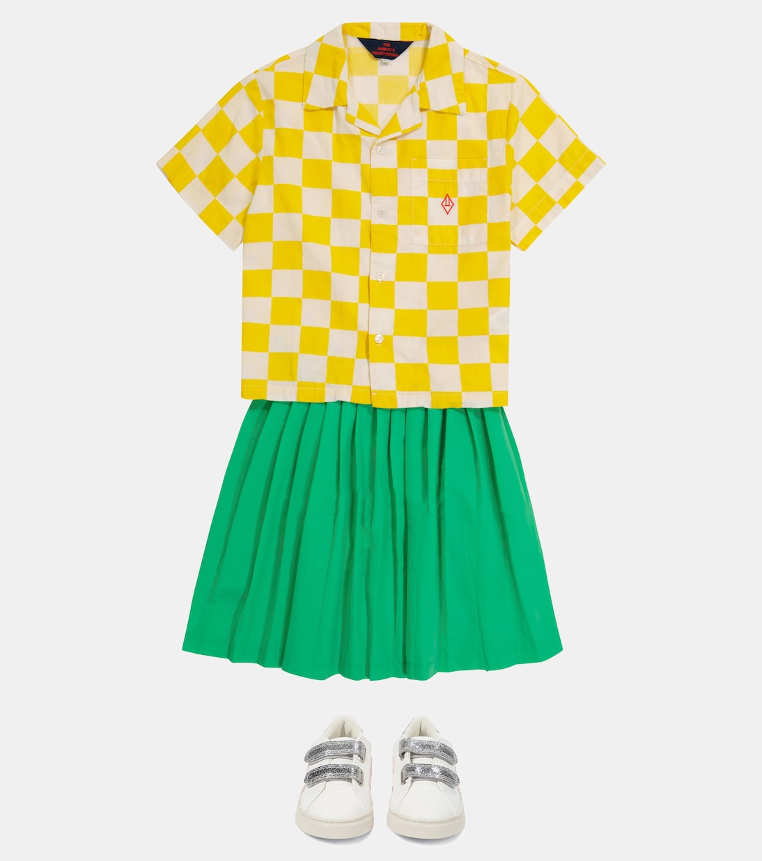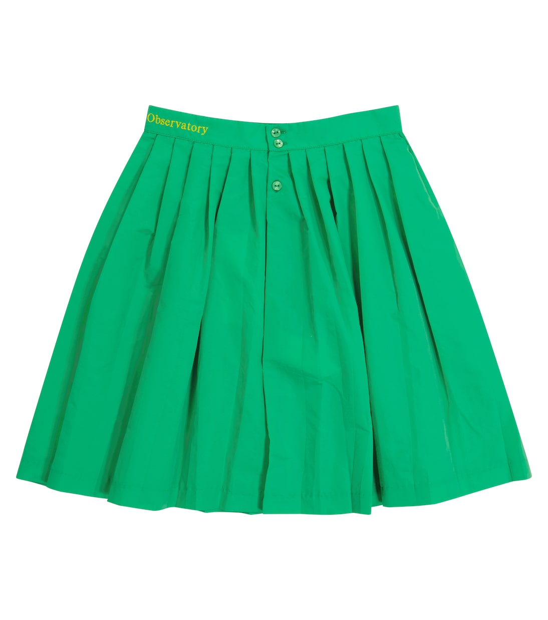 Юбка Cat от The Animals Observatory - универсальный вариант в стиле smart-casual для вашей малышки. Юбка травянисто-зеленого цвета с плиссировкой по всей поверхности и желтой вышивкой на поясе. Нам нравится планка с пуговицами и подол до колена, которые придают изделию винтажный вид.