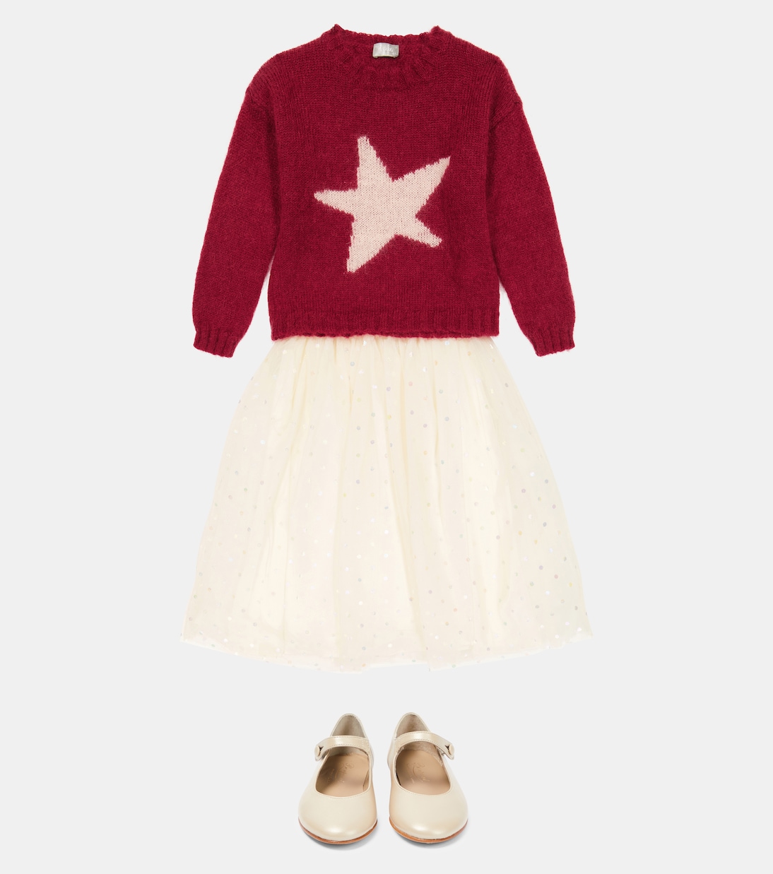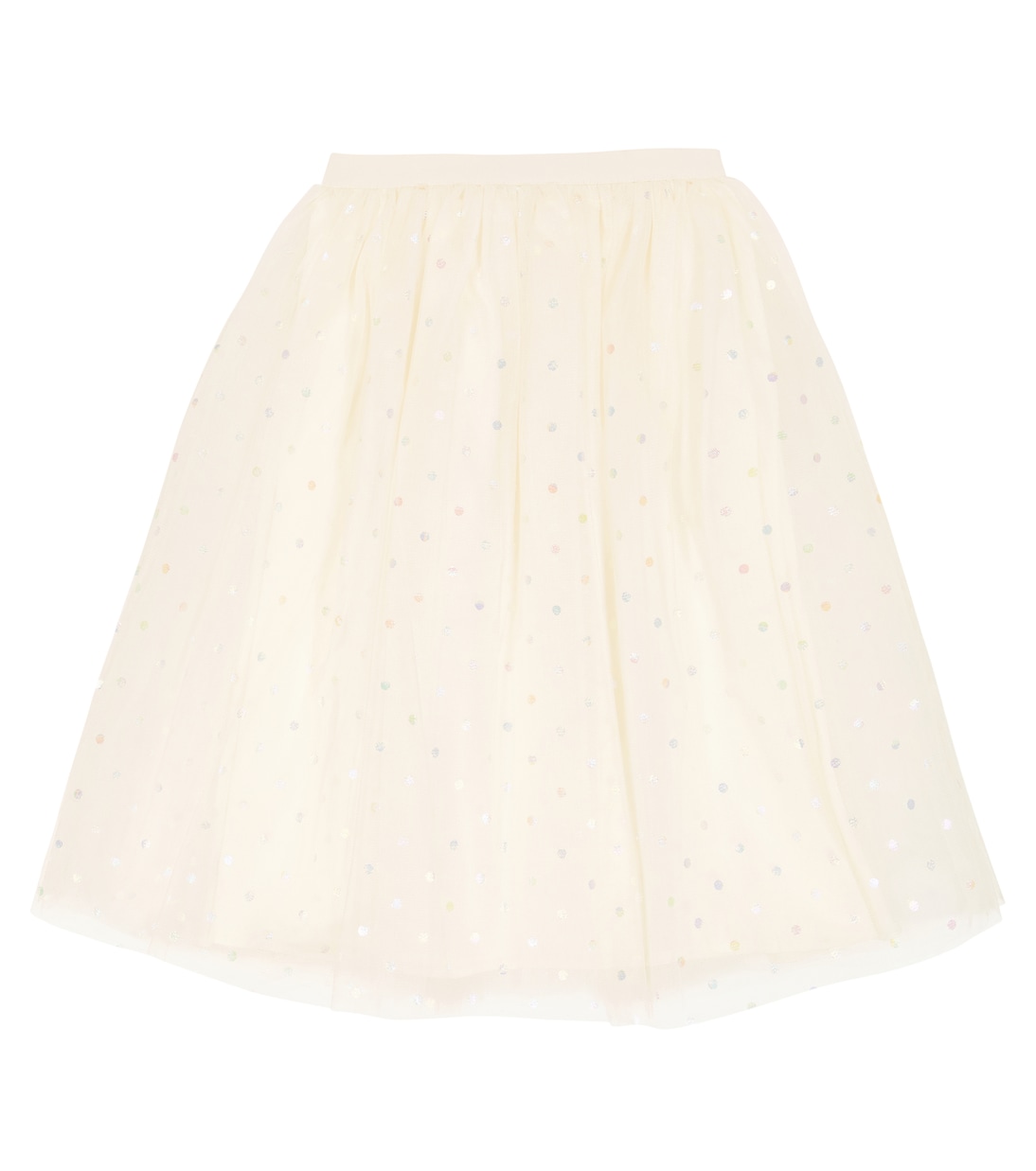 Юбка Panice от Bonpoint, созданная для маленьких девочек, которые любят кружиться, выполнена из слоев воздушного плиссированного тюля, создающего легкое воздушное движение. Талия на резинке и мерцающий металлический горошек.