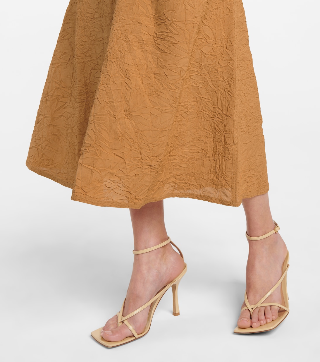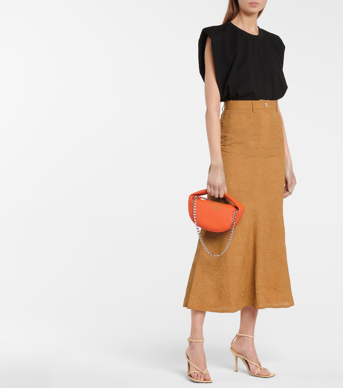 Юбка миди Bri от Nanushka - идеальный способ добавить немного фактуры в повседневные весенние и летние образы. Юбка с высокой посадкой и рифленым подолом выполнена из жатого сатина, напоминающего одновременно бумагу и джинсовую ткань. Дополните свой образ сандалиями с ремешками и любимой повседневной сумкой.
