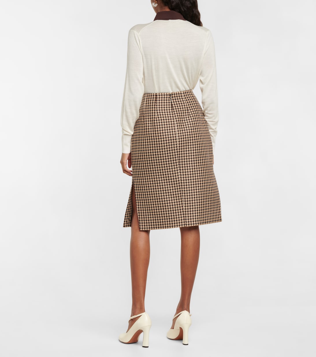 Юбка-карандаш Noah от Emilia Wickstead выполнена из шерстяной смеси с изысканным узором гусиная лапка. Эта модель длиной до колена имеет прямой крой и высокую посадку на талии.