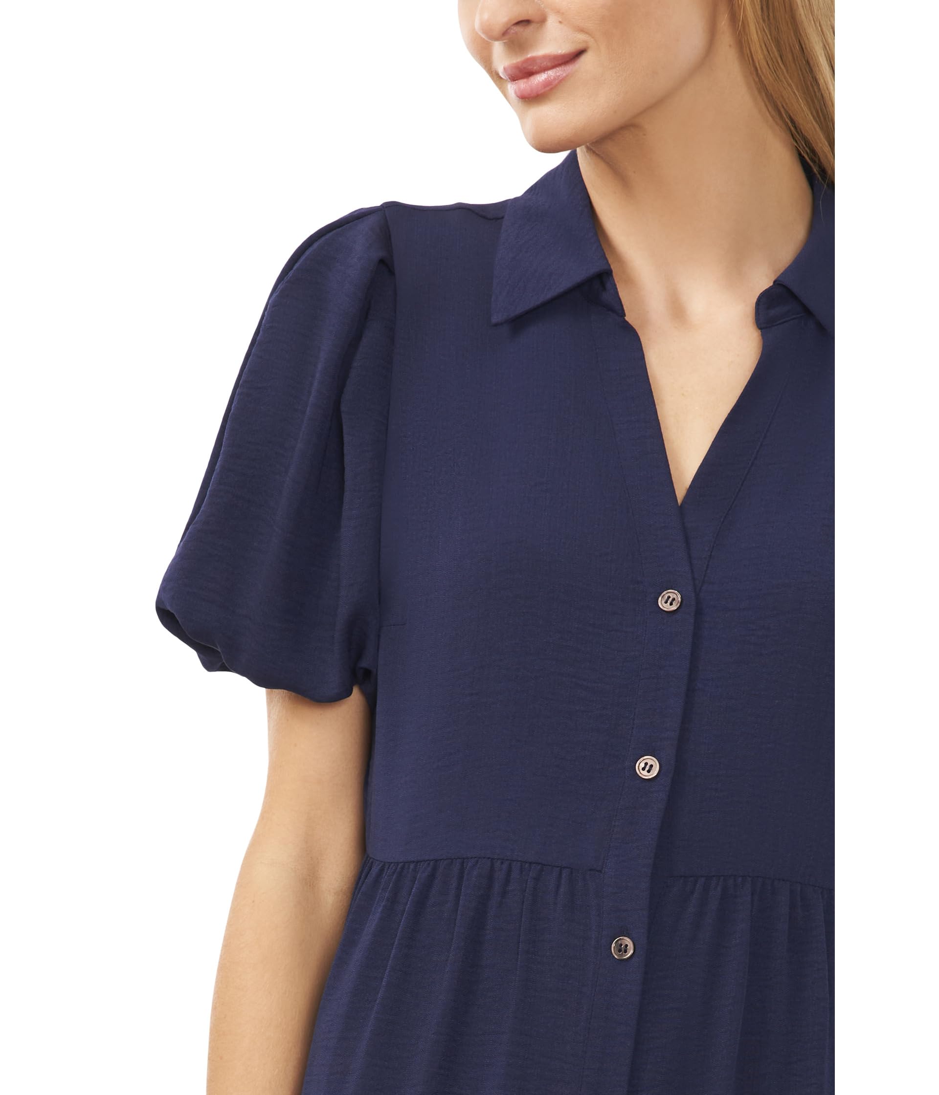 • Элегантное многоуровневое платье-рубашка CeCe с коротким рукавом сочетает в себе повседневный шарм и шикарный струящийся силуэт. Многоуровневый дизайн придает изделию текстуру и подвижность, а застежка спереди на пуговицах придает ему лоск для универсальности при носке. Это платье на пуговицах, сшитое из прочной жатой саржи, имеет подкладку для дополнительного покрытия. Модель с короткими рукавами, V-образным вырезом и многоуровневым низом.