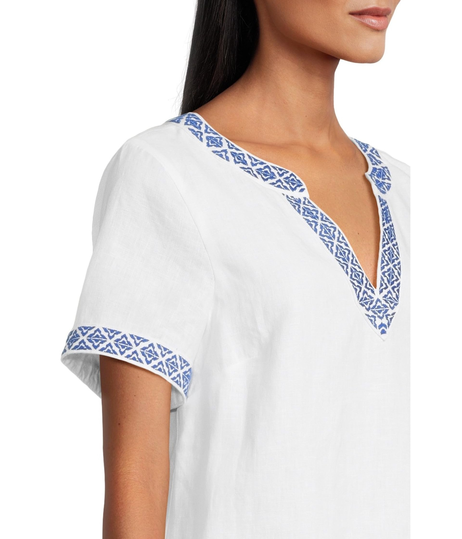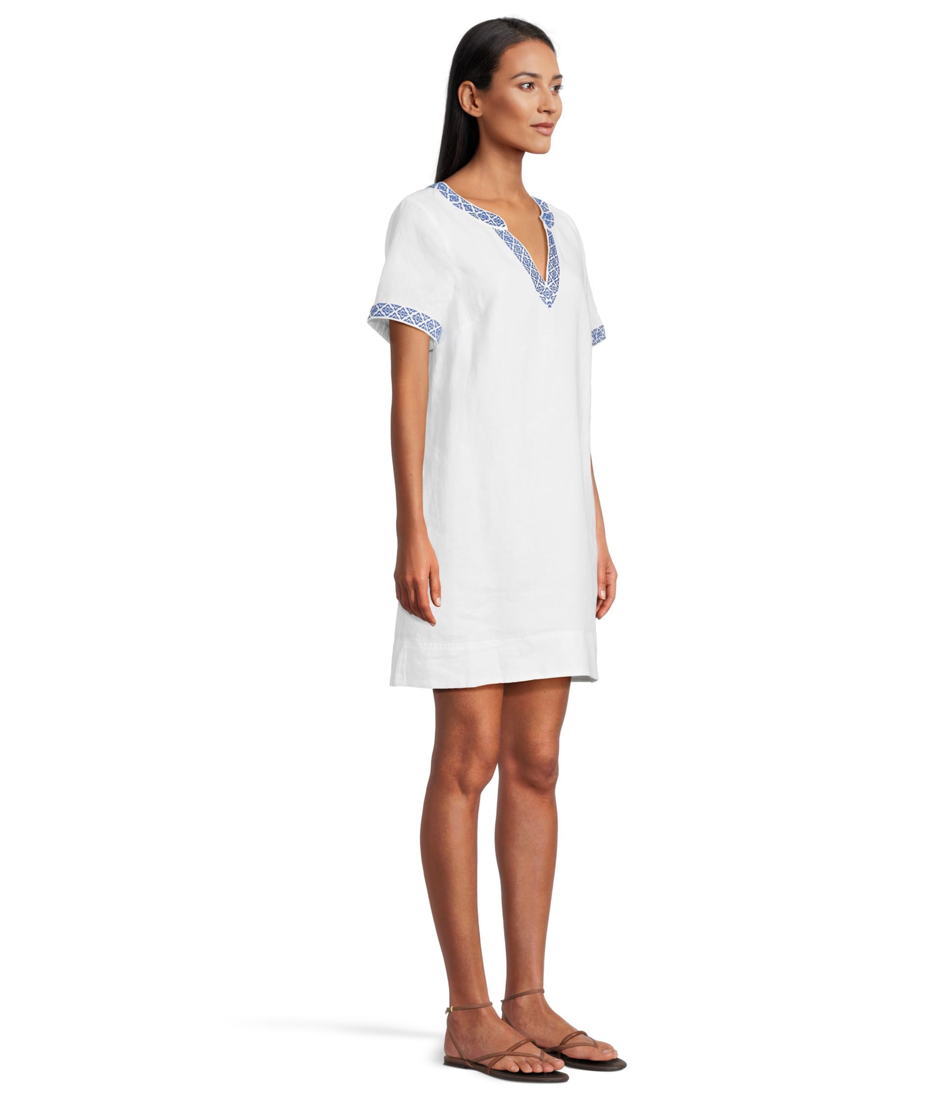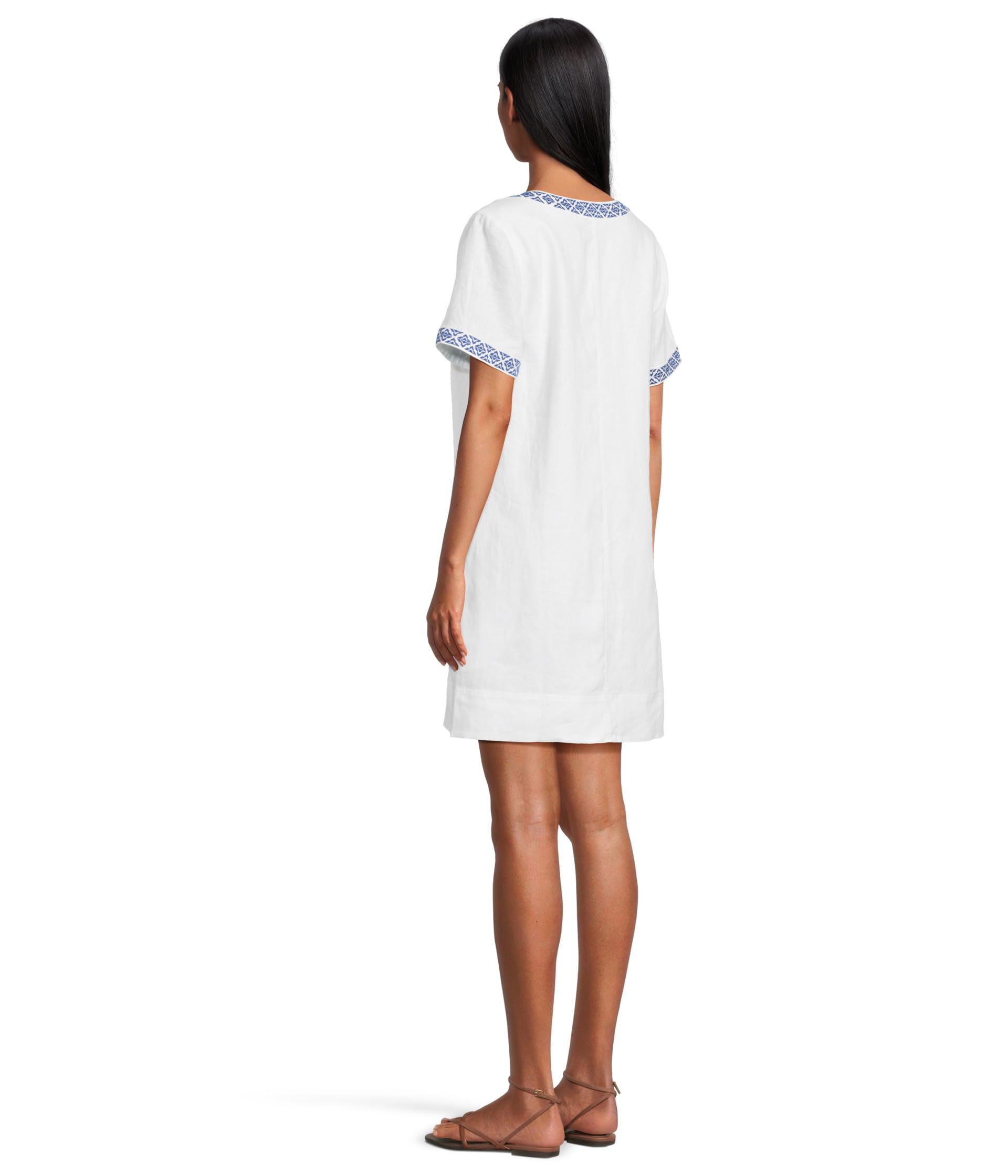 • Платье Tommy Bahama Two Palms Coastal Tiles с вышивкой на рукавах и вырезе станет стильным дополнением к вашему гардеробу. Сшитое из льняной ткани для комфорта в течение всего дня, это короткое платье с короткими рукавами, V-образным вырезом и прямым подолом.