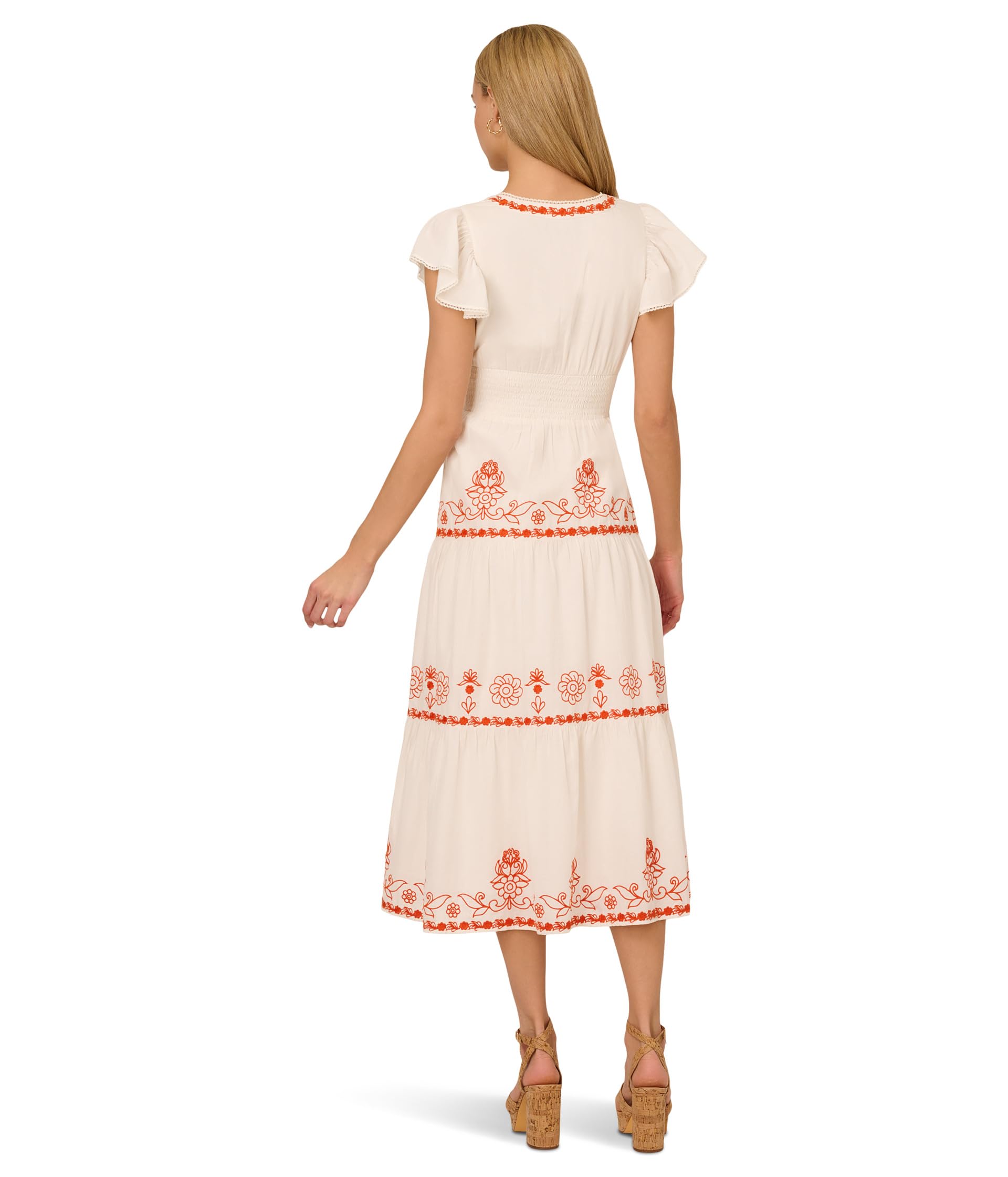 • Легкое, легкое и красиво оформленное длинное платье Adrianna Papell с запахом на талии изготовлено из хлопка, что делает его легким и дышащим для ношения в течение всего дня. Расклешенные рукава придают изделию шарм и подвижность, а эластичный пояс с манжетами обеспечивает облегающую посадку, столь же удобную, сколь и стильную. Это вышитое платье миди с V-образным вырезом, многоярусной юбкой и вышитыми деталями. Идеально подходящее для прогулок в теплую погоду или повседневных мероприятий, это платье сочетает в себе легкость и элегантность в едином вневременном дизайне.