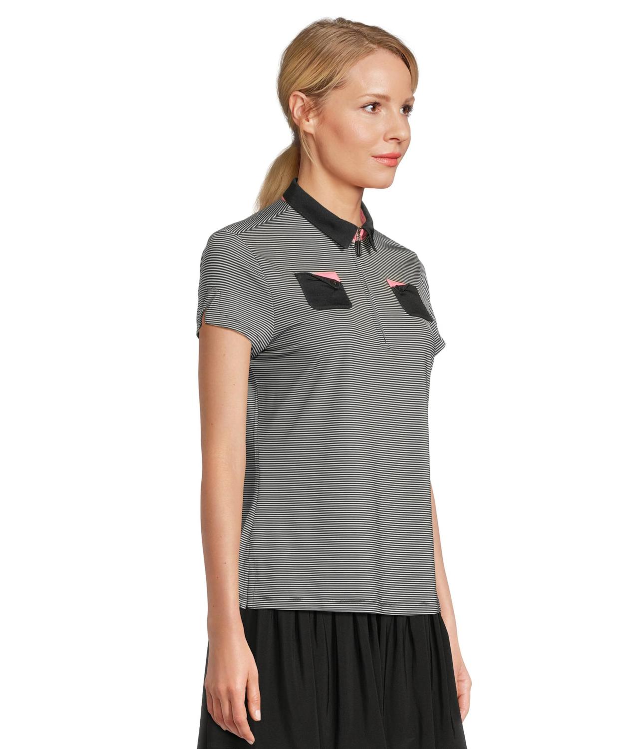 • Полосатый топ с коротким рукавом Jamie Sadock, изготовленный из легкой и дышащей эластичной ткани Cooltrex performance, добавит комфорта вашему повседневному образу жизни. Приталенный топ с традиционным воротником-стойкой для поло, короткими рукавами, планкой на потайной молнии, сплошным принтом в полоску и прямым низом.