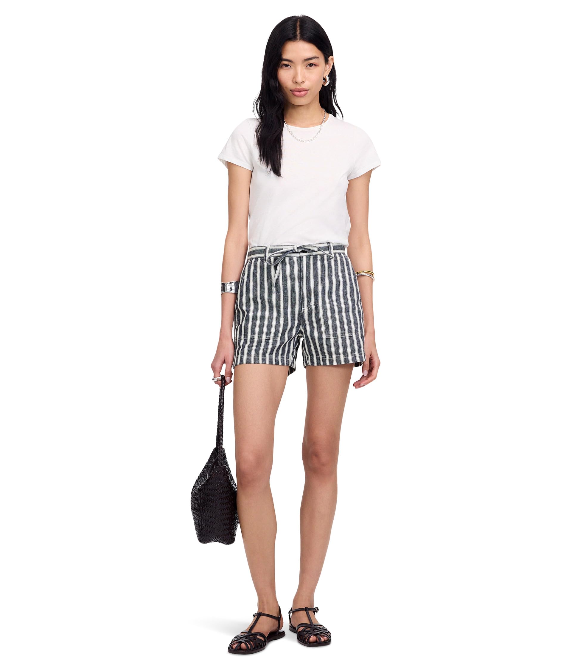 • Сохраняйте непринужденный вид в шортах Madewell Универсальные шорты E Back из саржи в полоску. Модель с пуговицами спереди и застежкой на молнию, поясной шлевкой на талии, кулиской, боковыми карманами для рук, накладными карманами сзади и прямым подолом.